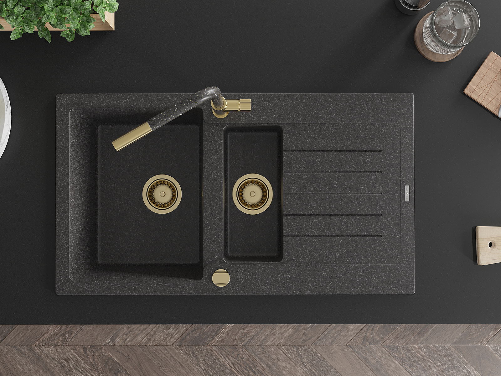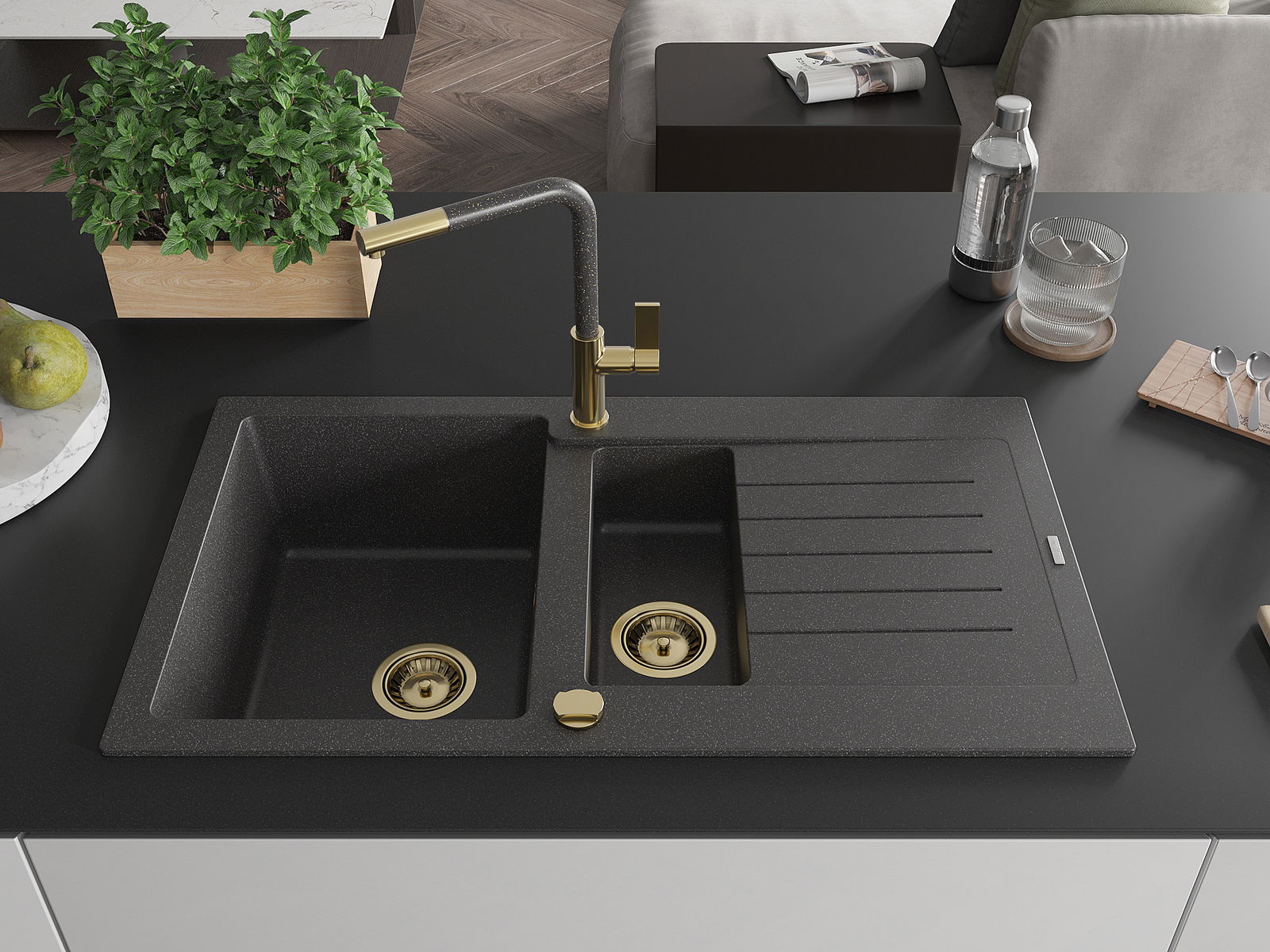 Mexen Matias chiuvetă granit 1,5-bazin cu scurgător și baterie bucătărie Flora, negru pătat - 6502-76-670401-75-G