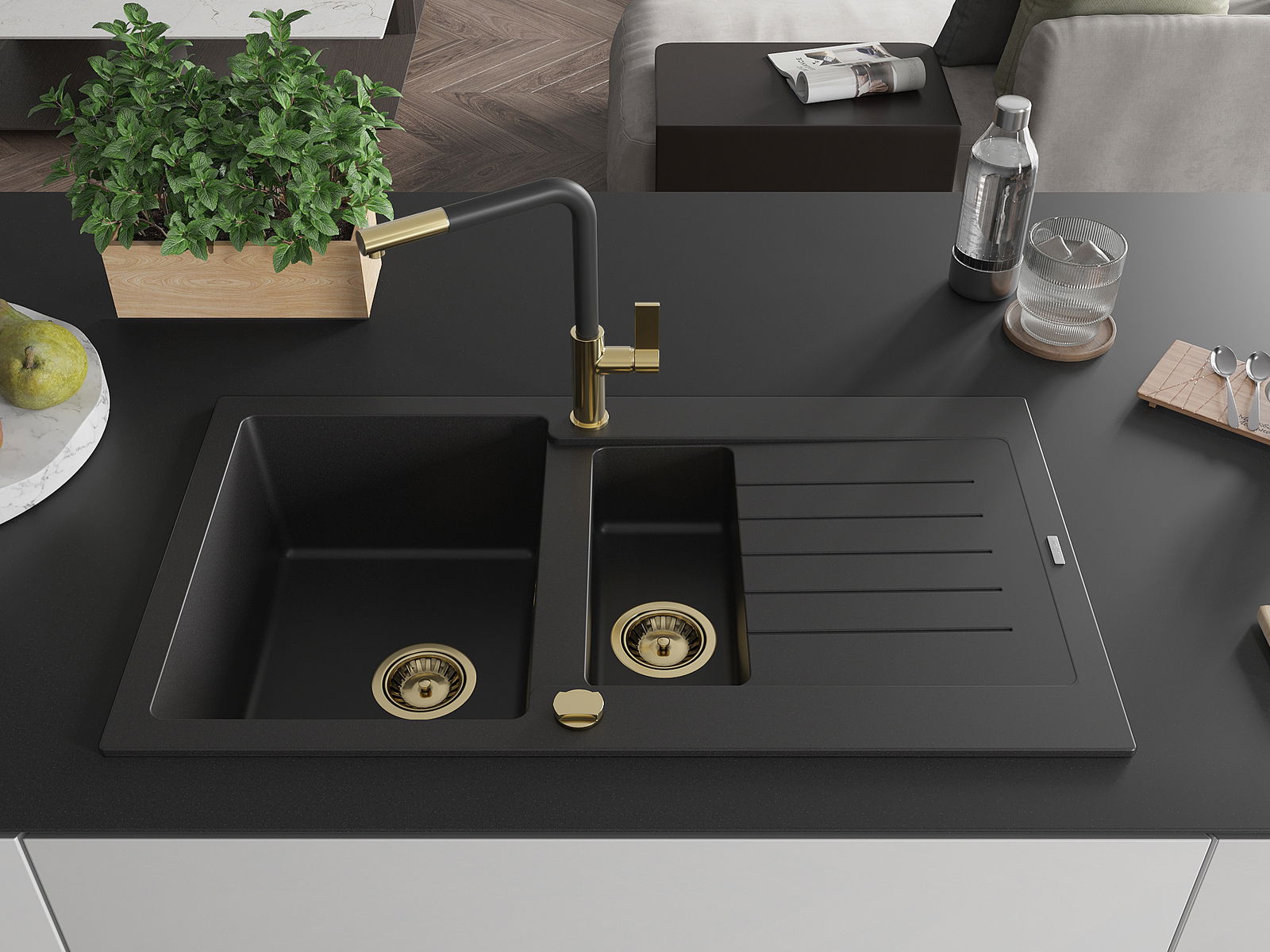 Mexen Matias chiuvetă din granit cu 1,5 compartimente, cu scurgător și baterie de bucătărie Flora, negru - 6502-77-670401-57-G
