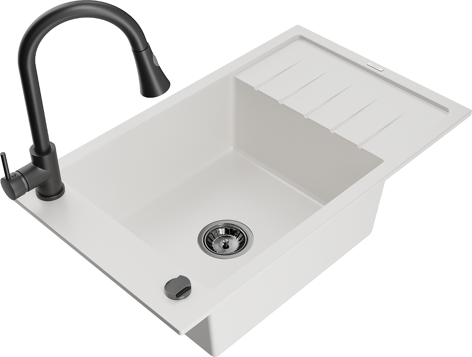 Mexen Elias chiuvetă din granit cu 1 compartiment cu scurgător și baterie de bucătărie Elia, alb - 6511-20-670101-70