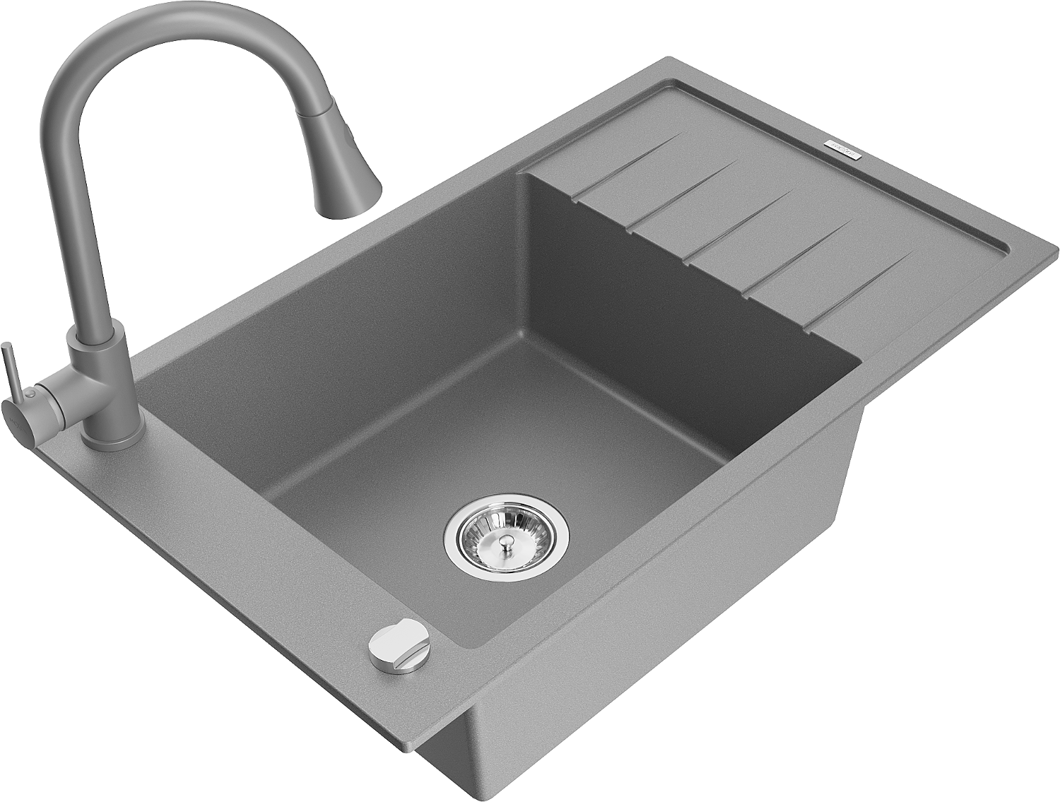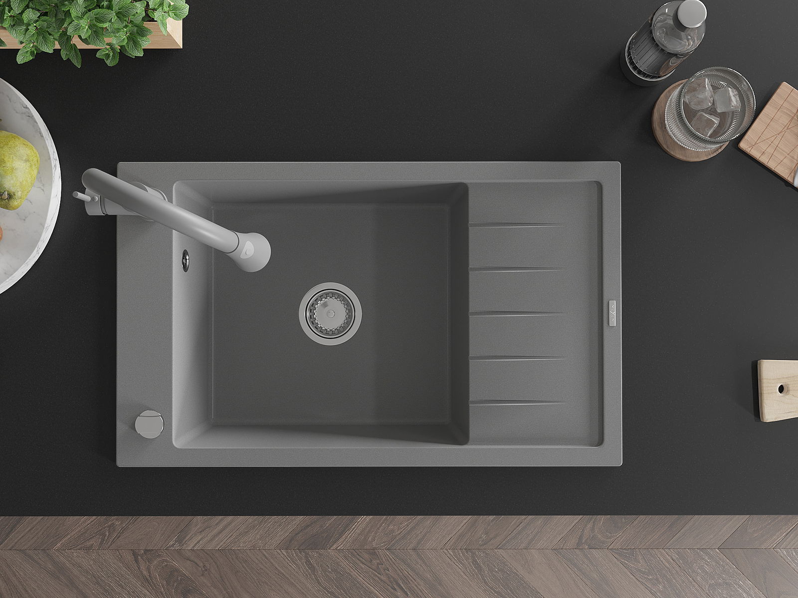 Mexen Elias chiuvetă din granit cu 1 compartiment cu scurgător și baterie de bucătărie Elia, gri - 6511-71-670101-71
