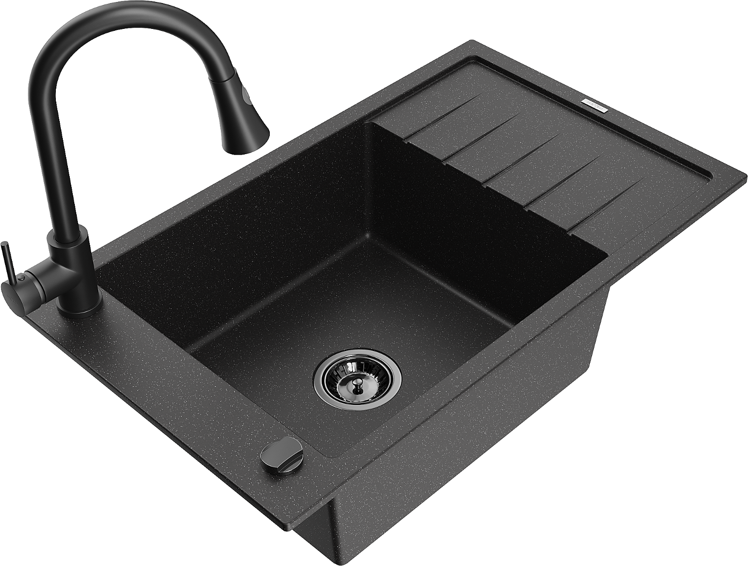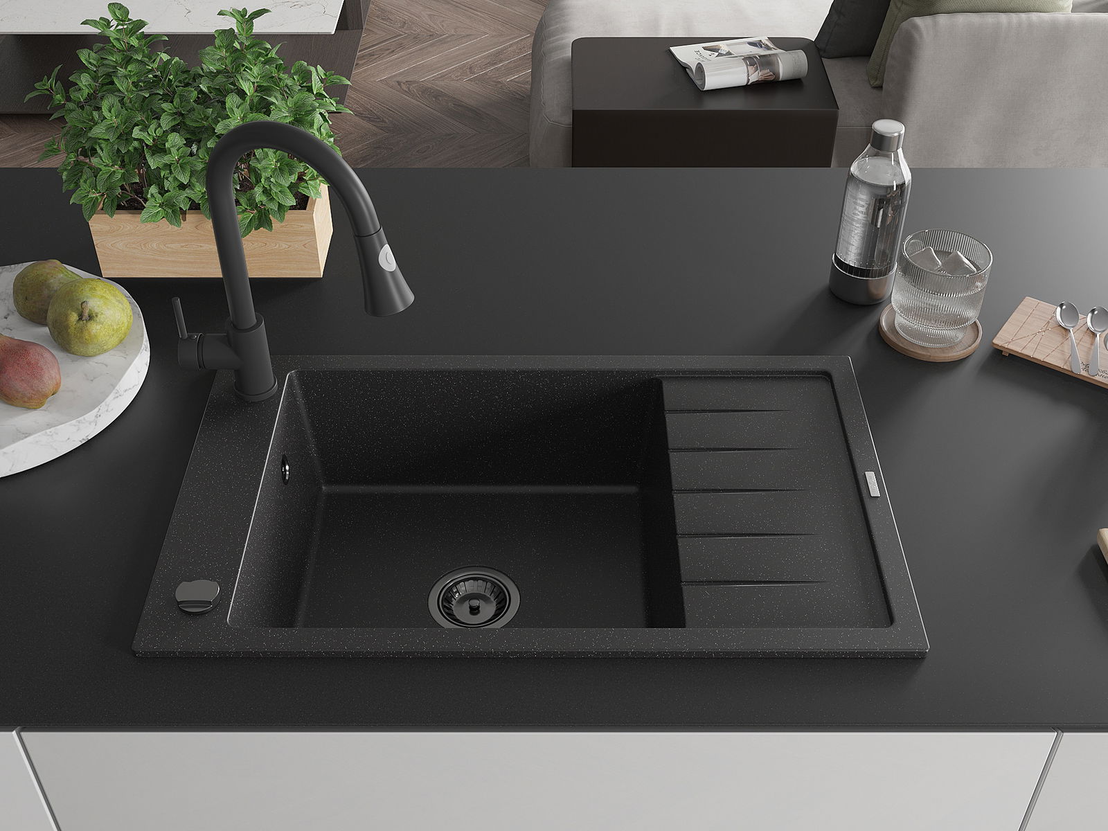 Mexen Elias chiuvetă granit 1 compartiment cu scurgător și baterie bucătărie Elia, negru/argintiu metalic