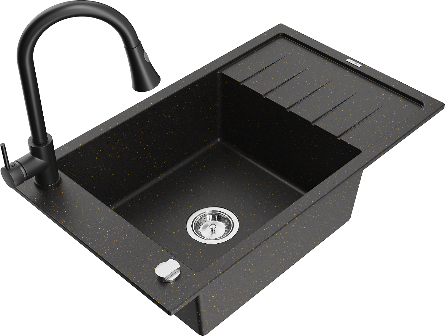 Mexen Elias chiuvetă de bucătărie din granit cu o singură cuvă, cu scurgător și robinet Elia, negru/auriu metalic