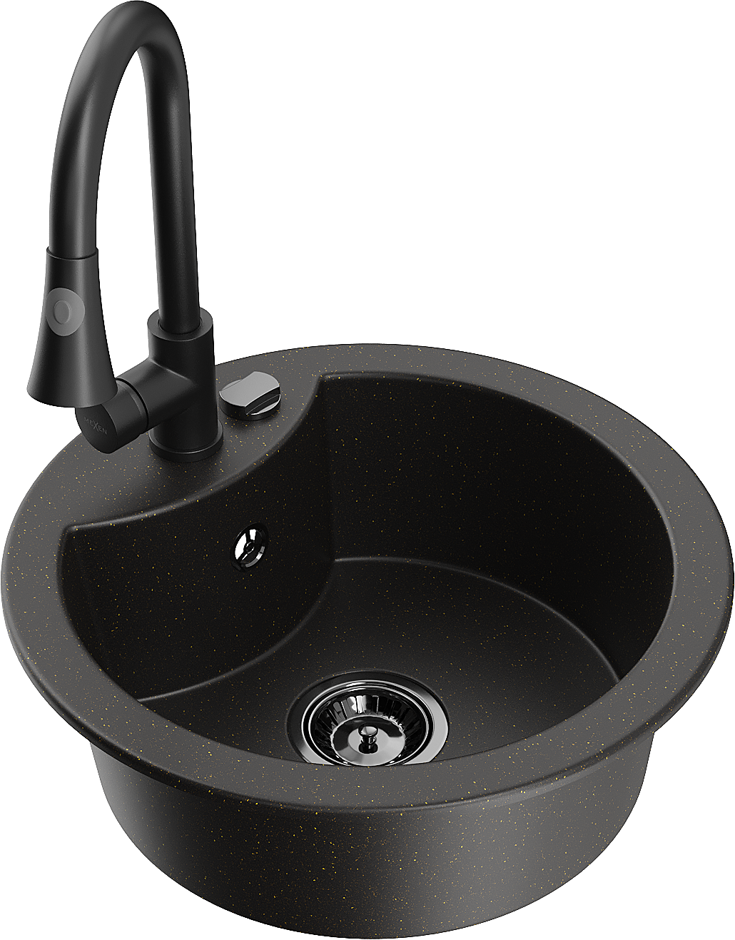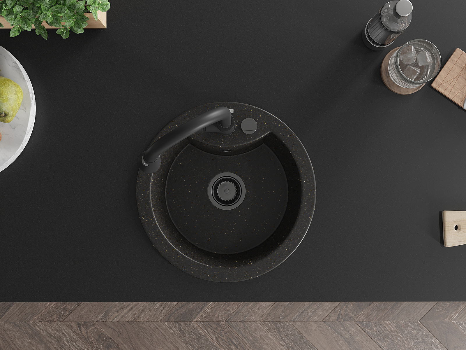 Mexen Diego chiuvetă de granit cu 1 compartiment și baterie de bucătărie Elia, negru/auriu metalizat - 6512-75-670101-70-B