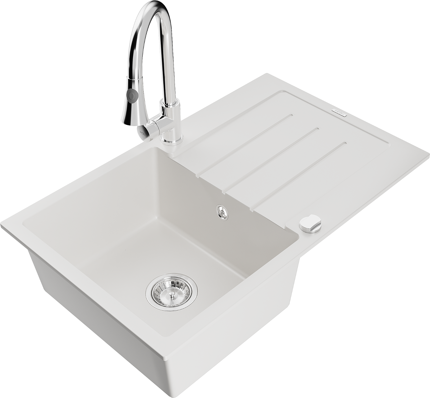 Mexen Bruno chiuvetă de granit cu o singură cuvă cu scurgător și baterie de bucătărie Elia, alb - 6513-20-670101-00