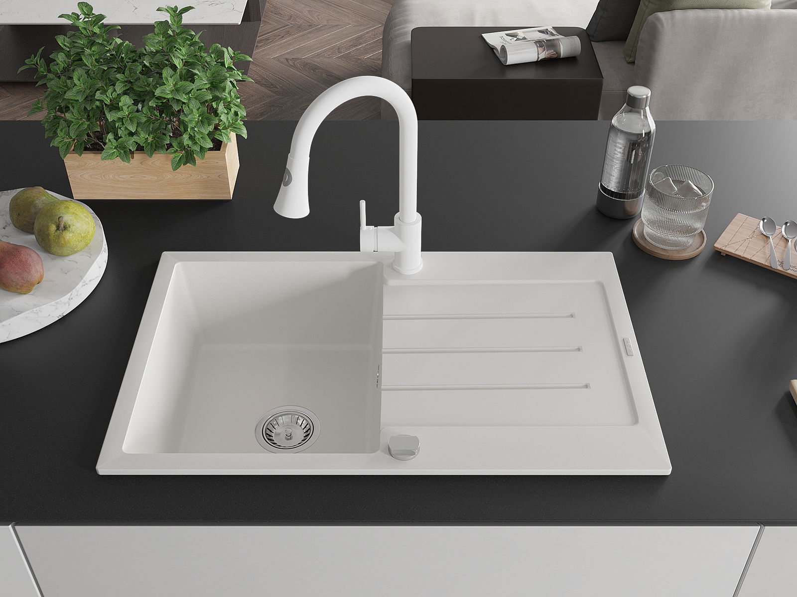 Mexen Bruno chiuvetă de granit cu o singură cuvă cu picurător și baterie de bucătărie Elia, alb - 6513-20-670101-20