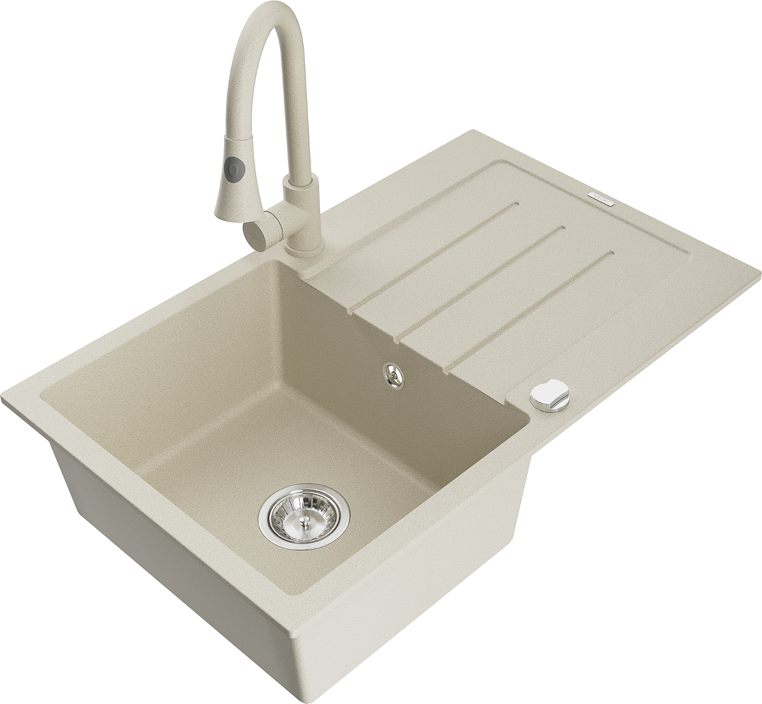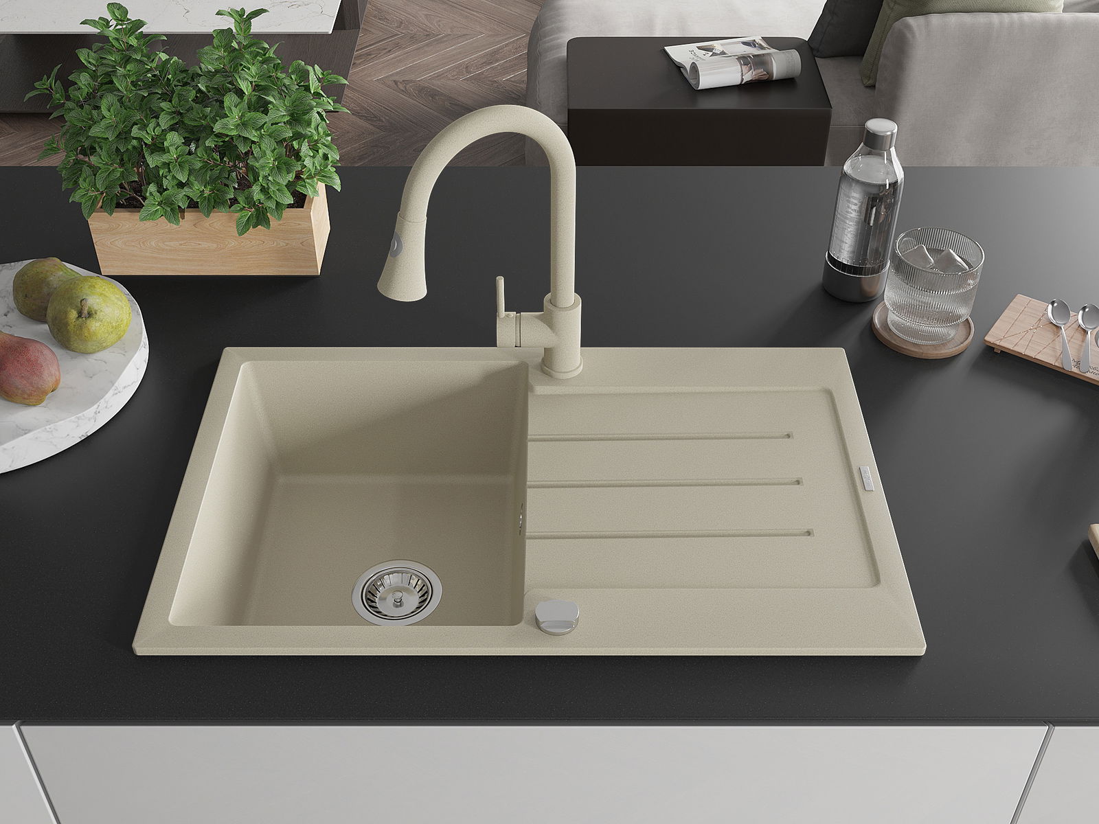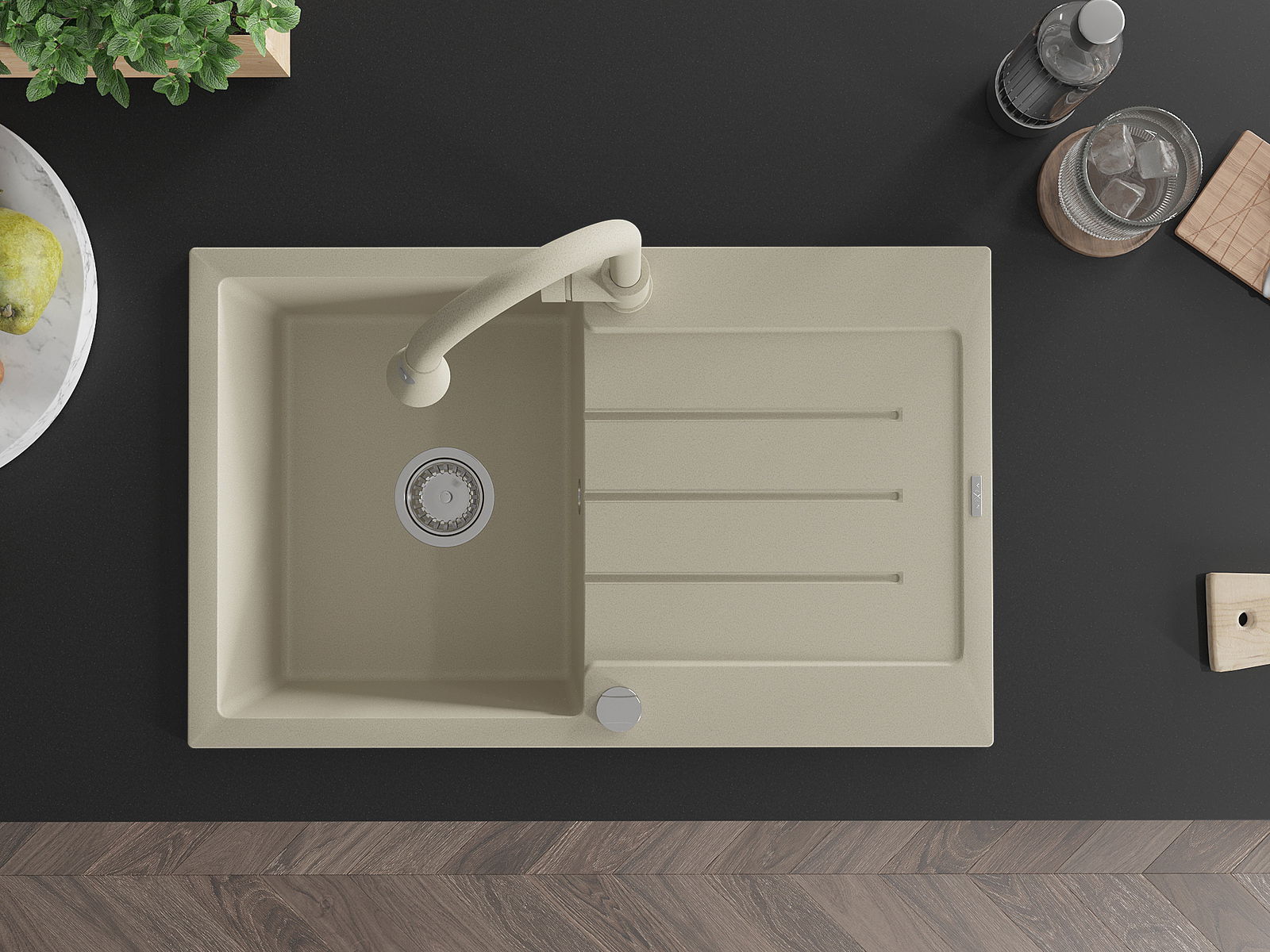 Mexen Bruno chiuvetă din granit cu 1 compartiment, cu drenator și baterie de bucătărie Elia, bej - 6513-69-670101-69