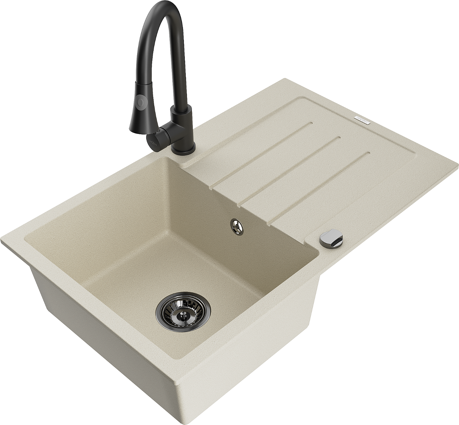 Mexen Bruno chiuvetă de granit cu 1 cuvă și scurgător și baterie de bucătărie Elia, bej - 6513-69-670101-70