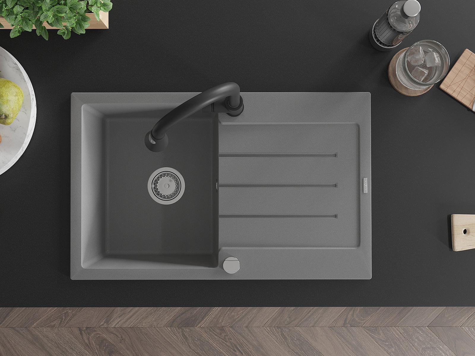 Mexen Bruno chiuvetă de bucătărie din granit cu 1 compartiment și scurgător și cu baterie de bucătărie Elia, gri - 6513-71-6701?
