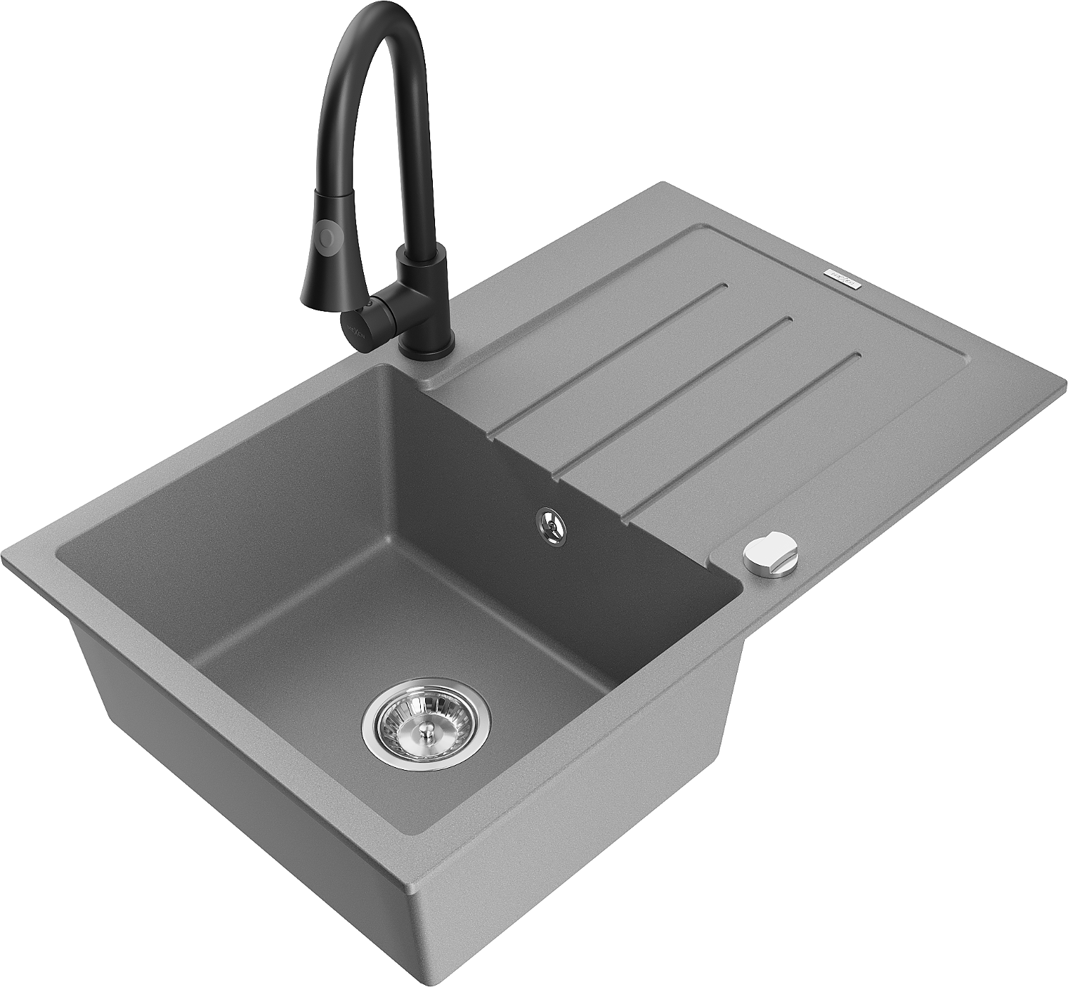 Mexen Bruno chiuvetă de granit cu o singură cuvă cu scurgător și baterie de bucătărie Elia, gri - 6513-71-670101-70