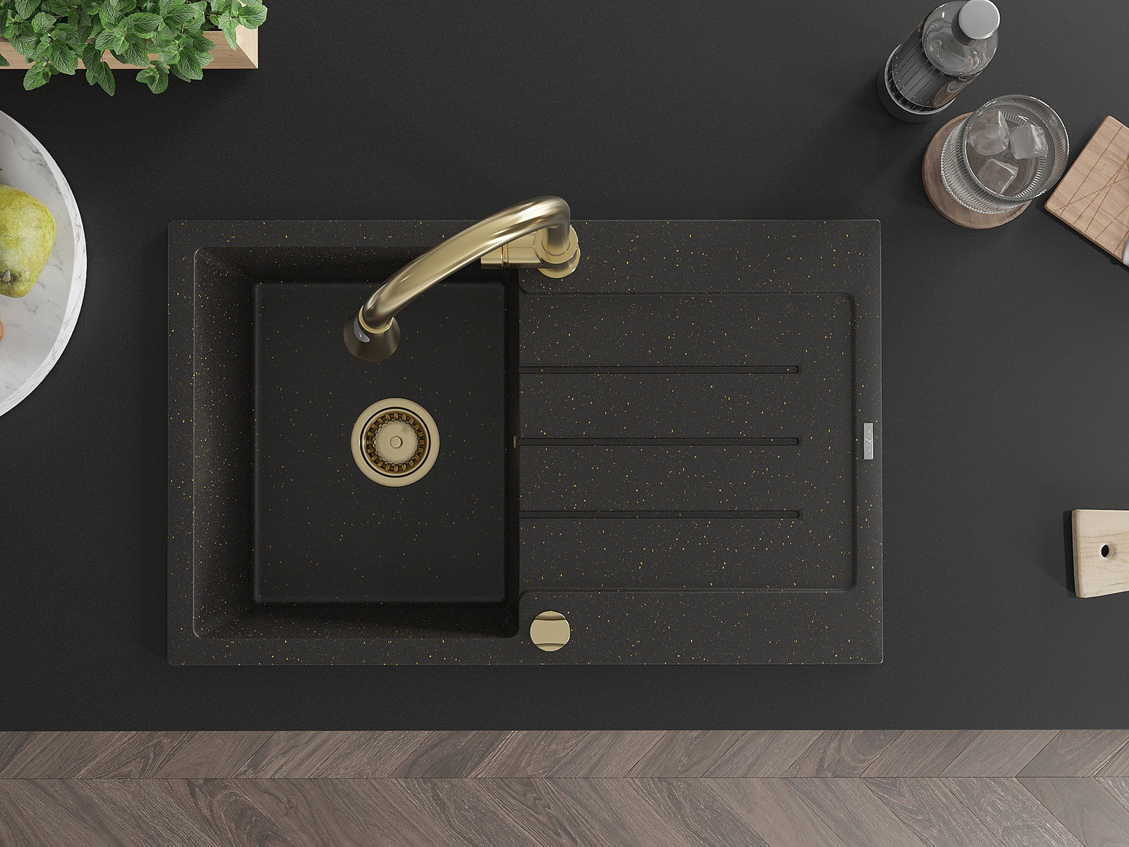Mexen Bruno chiuvetă de granit cu o cuvă, cu scurgător și baterie de bucătărie Elia, metalic negru/auriu