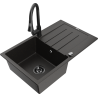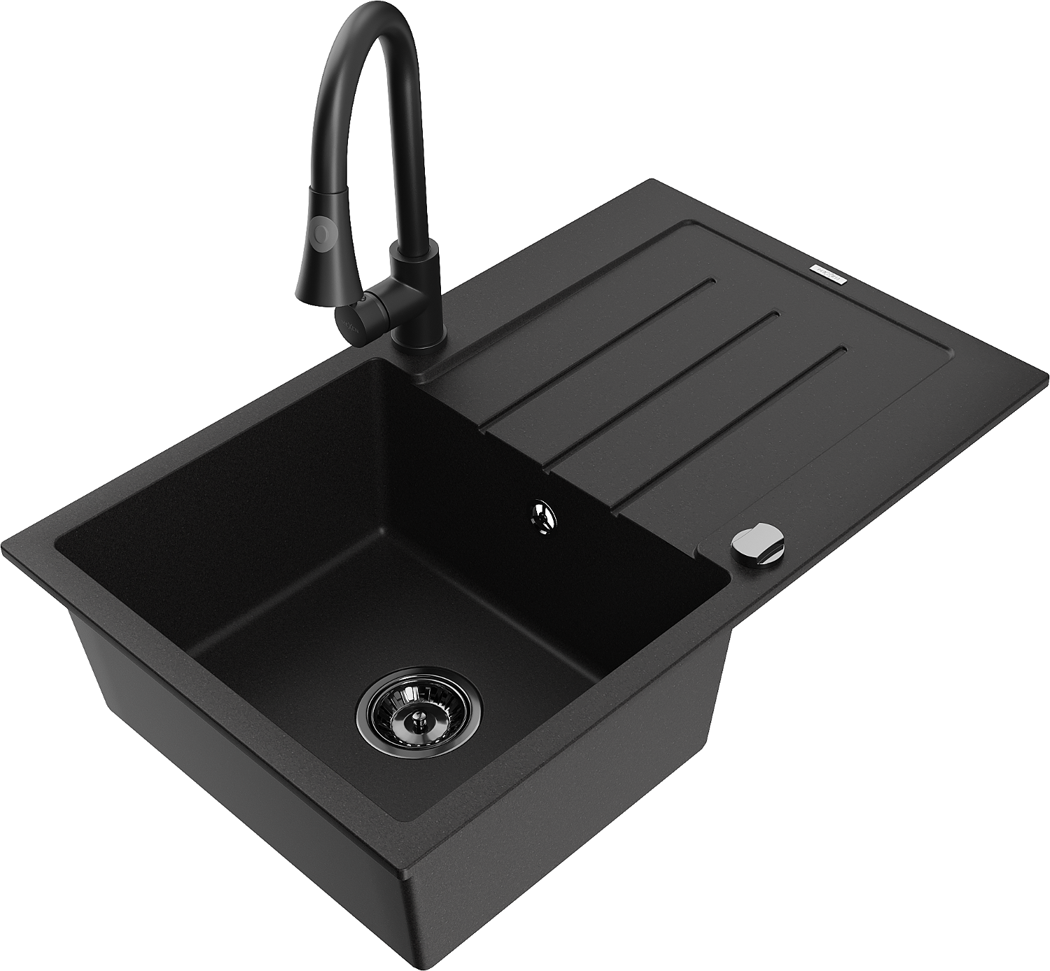 Mexen Bruno chiuvetă de bucătărie din granit cu 1 cuvă și picurător și baterie de bucătărie Elia, neagră - 6513-77-670101-70-B