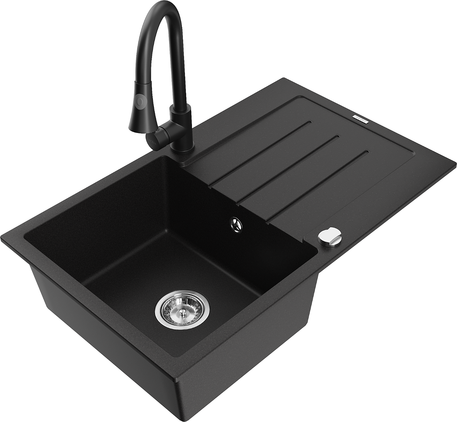 Mexen Bruno chiuvetă de granit cu o singură cameră cu scurgător și baterie de bucătărie Elia, negru - 6513-77-670101-70