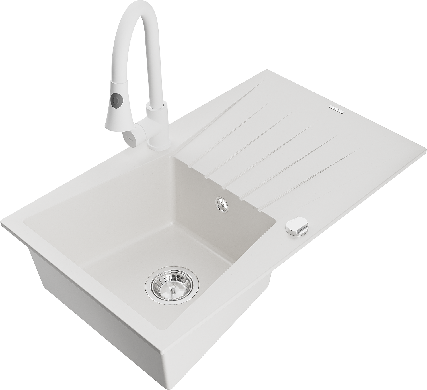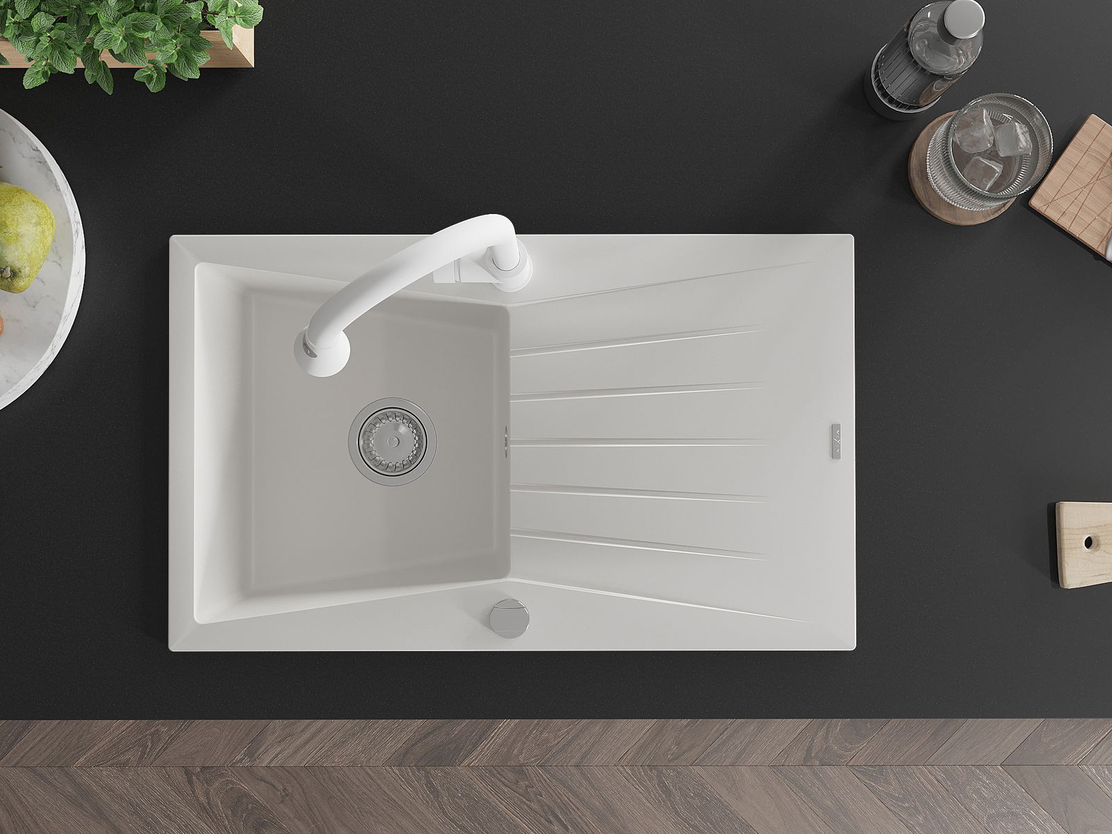 Mexen Cesar chiuvetă granit 1 cameră cu scurgător și baterie de bucătărie Elia, alb - 6514-20-670101-20