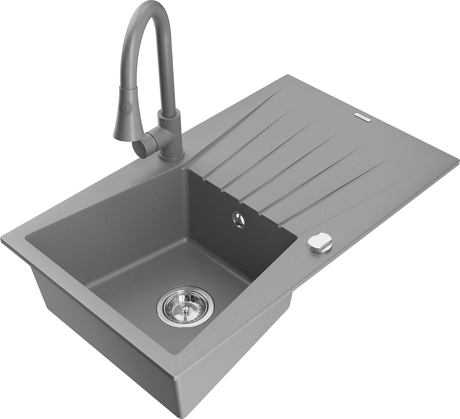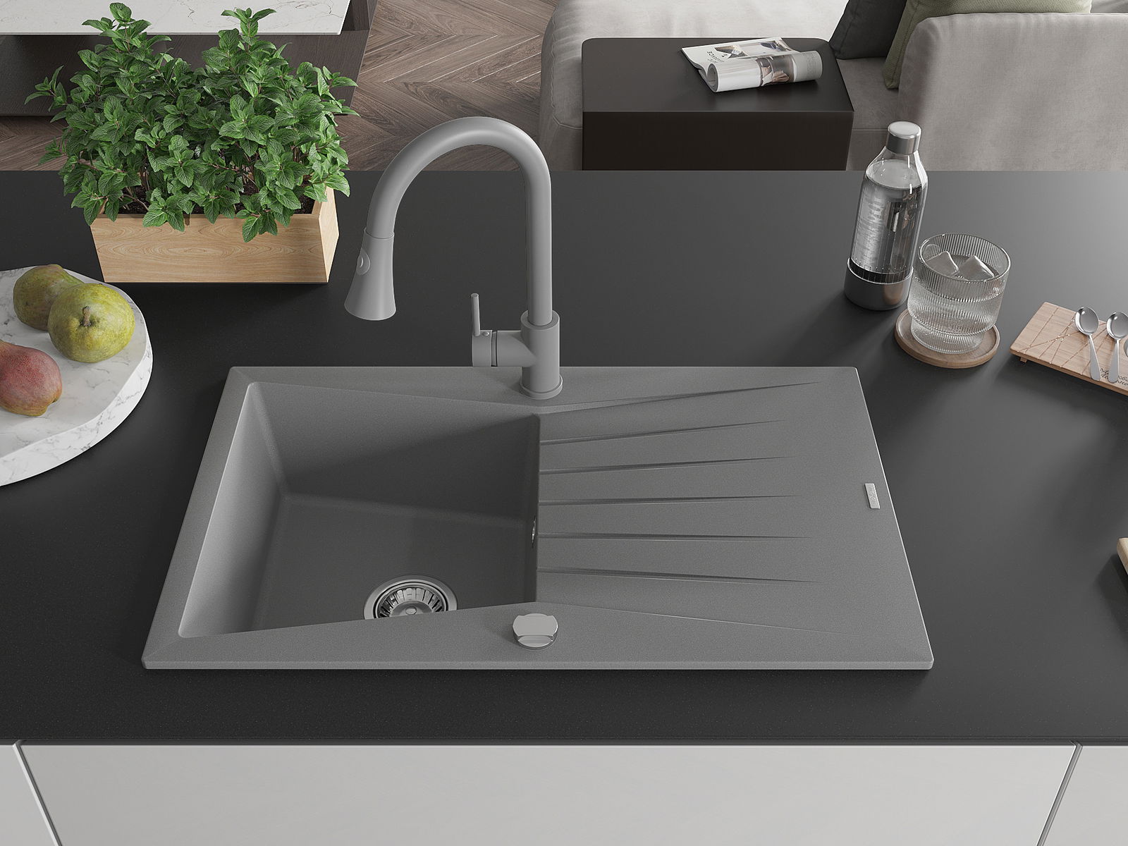 Mexen Cesar chiuvetă de bucătărie din granit cu o cuvă și scurgător și baterie Elia, gri - 6514-71-670101-71