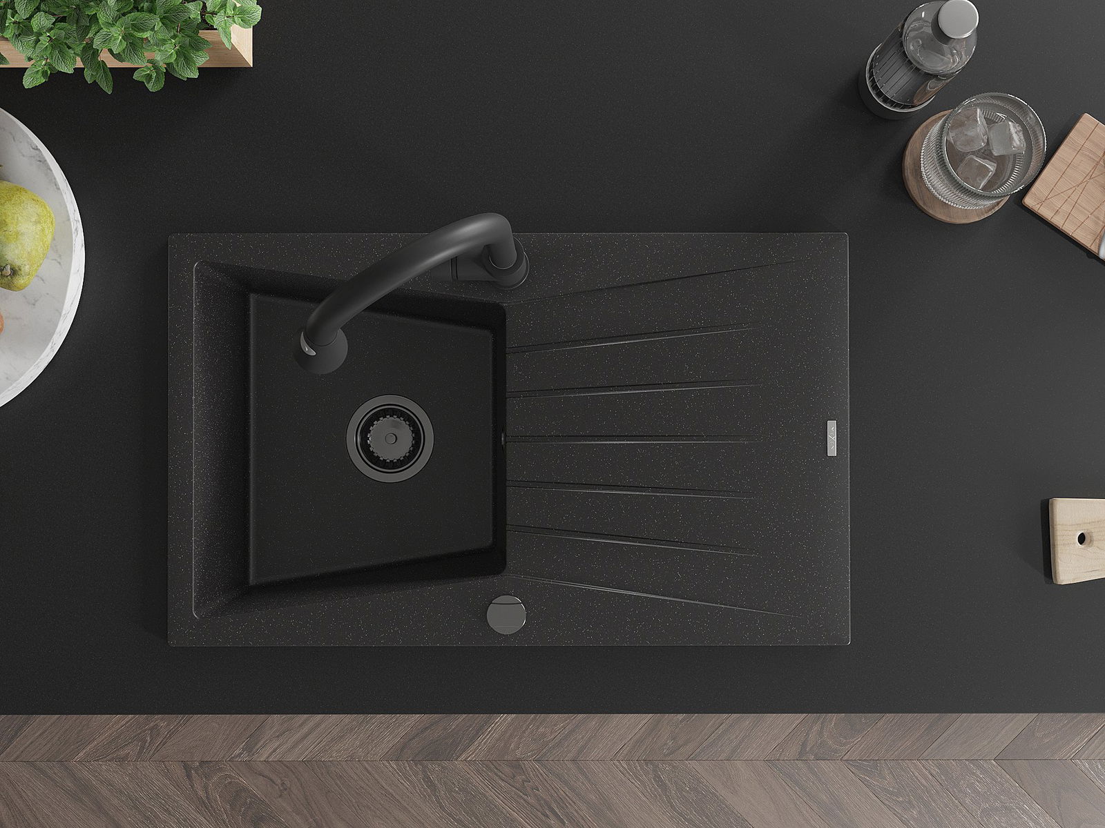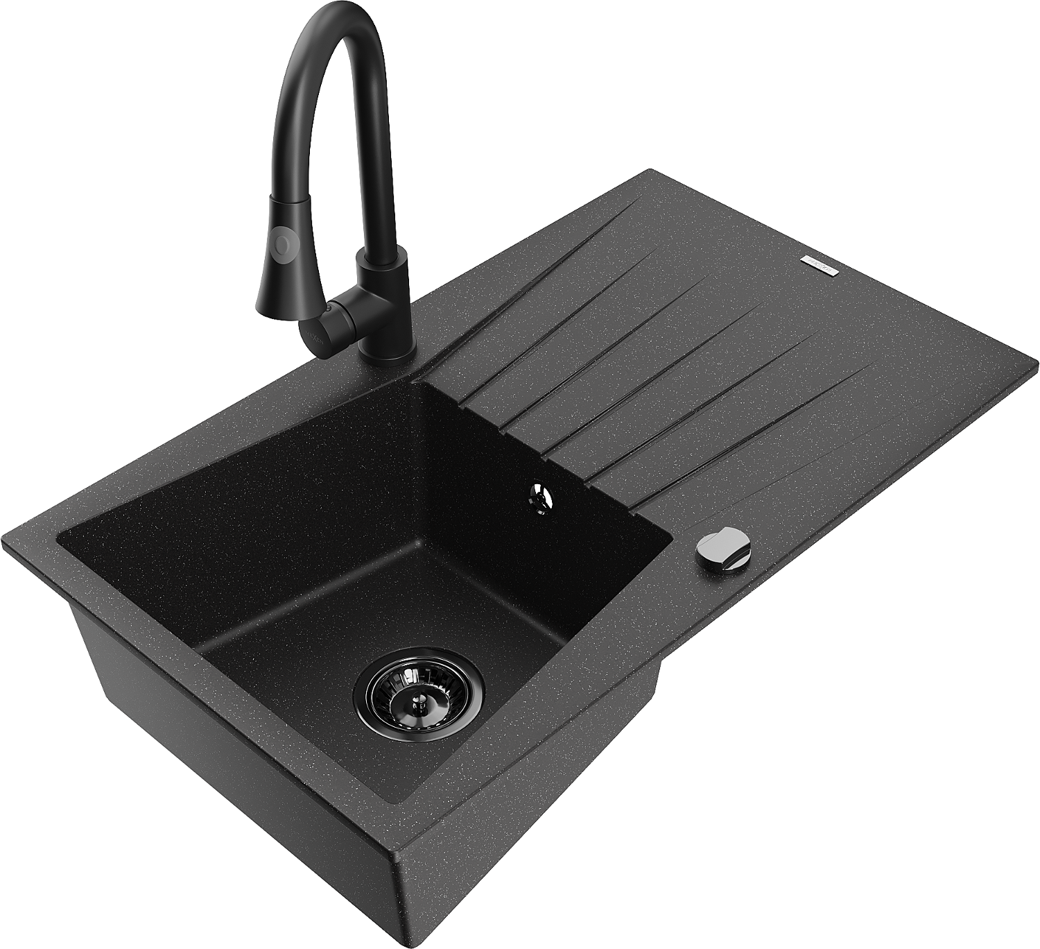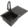 Mexen Cesar chiuvetă din granit cu 1 compartiment, cu picurător și baterie de bucătărie Elia, negru/metalic argintiu