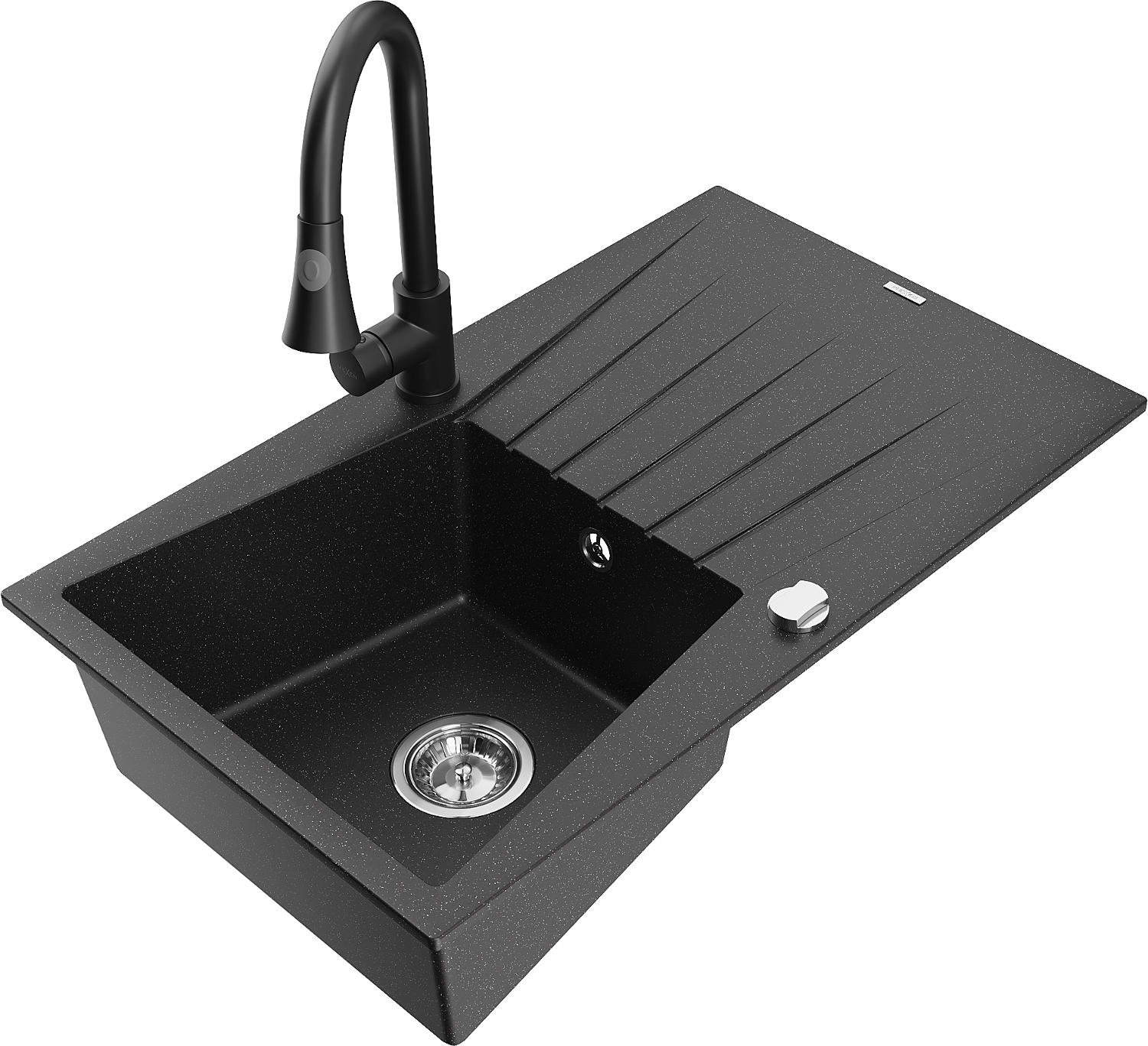 Mexen Cesar chiuvetă de granit cu 1 compartiment cu scurgător și baterie de bucătărie Elia, negru/argintiu metalic