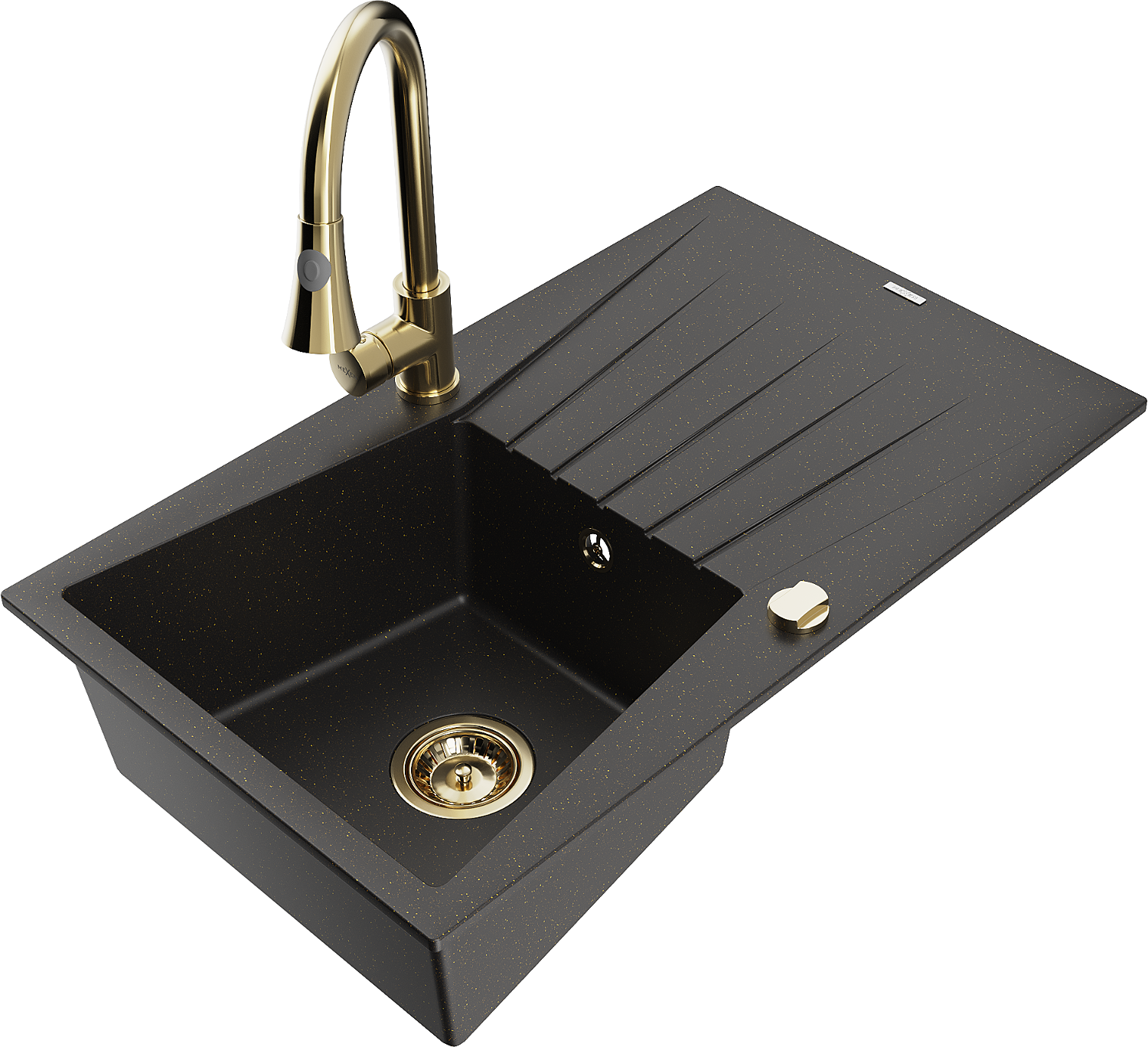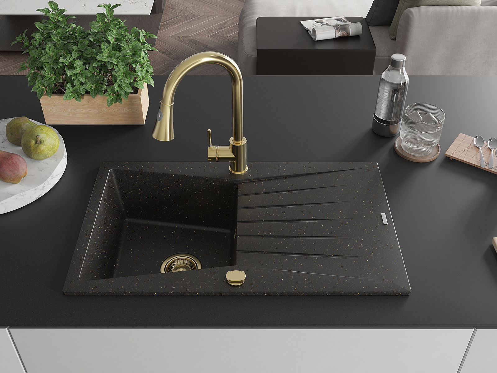 Mexen Cesar chiuvetă de bucătărie din granit cu 1 compartiment cu picurător și baterie Elia, negru/auriu metalizat