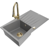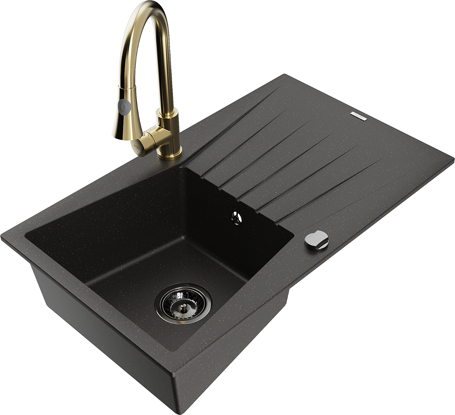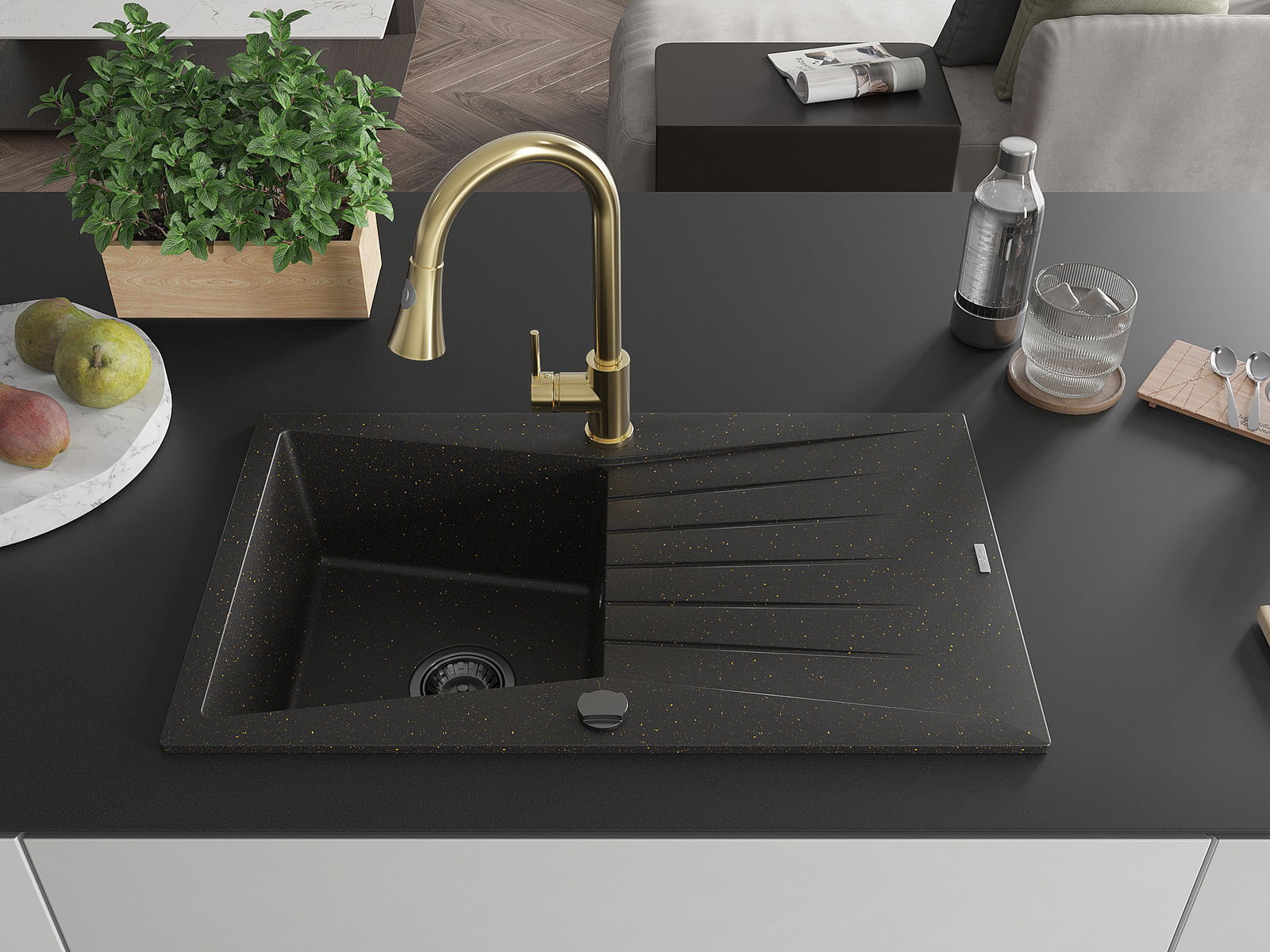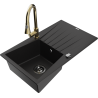 Mexen Cesar chiuvetă de granit cu 1 compartiment cu scurgător și baterie de bucătărie Elia, negru/auriu metalizat