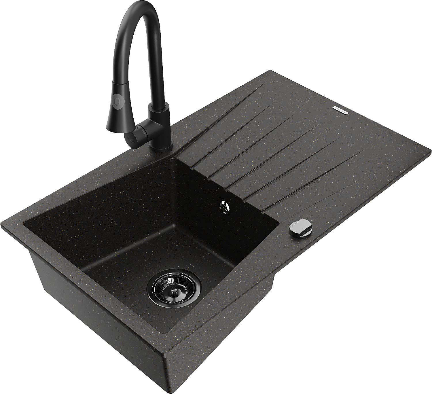 Mexen Cesar chiuvetă de granit cu o cuvă și scurgător, cu baterie de bucătărie Elia, negru/auriu metalic