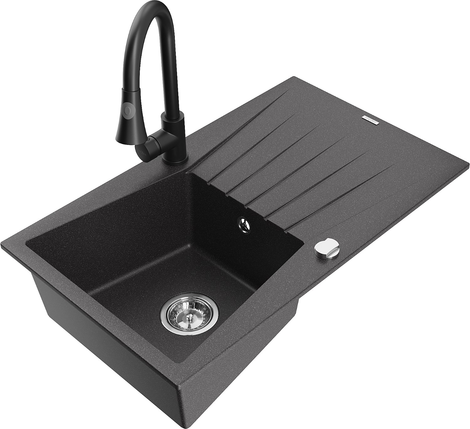 Mexen Cesar chiuvetă de granit cu 1 compartiment cu picurător și baterie de bucătărie Elia, negru presărat