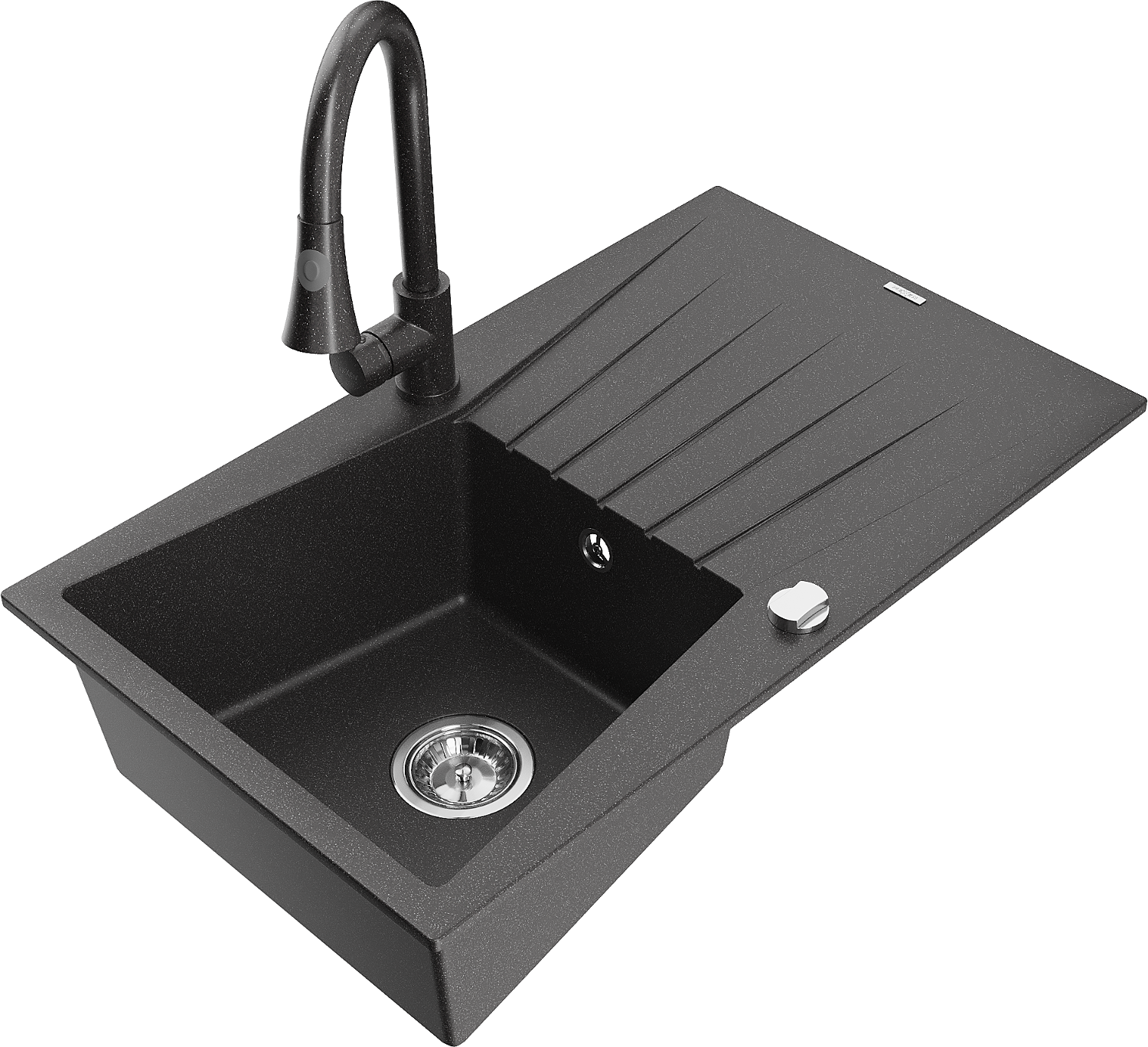 Mexen Cesar chiuvetă de granit cu 1 compartiment cu scurgător și robinet de bucătărie Elia, negru cu stropi - 6514-76-670101-76