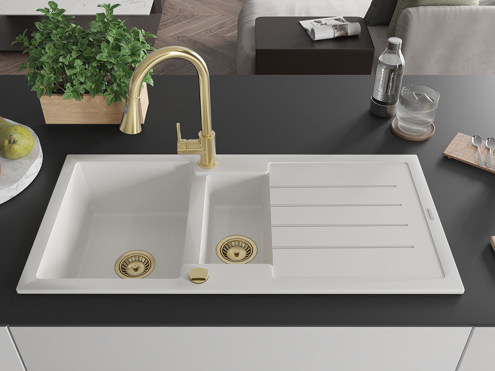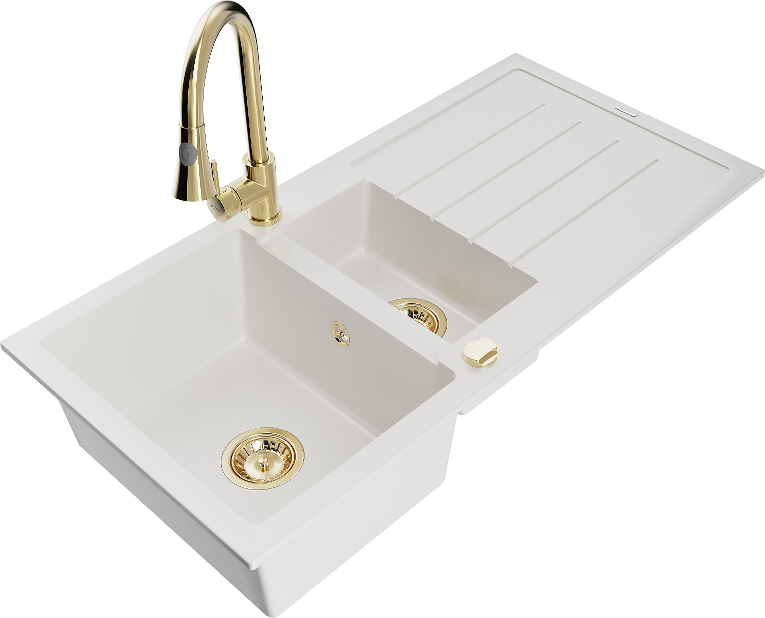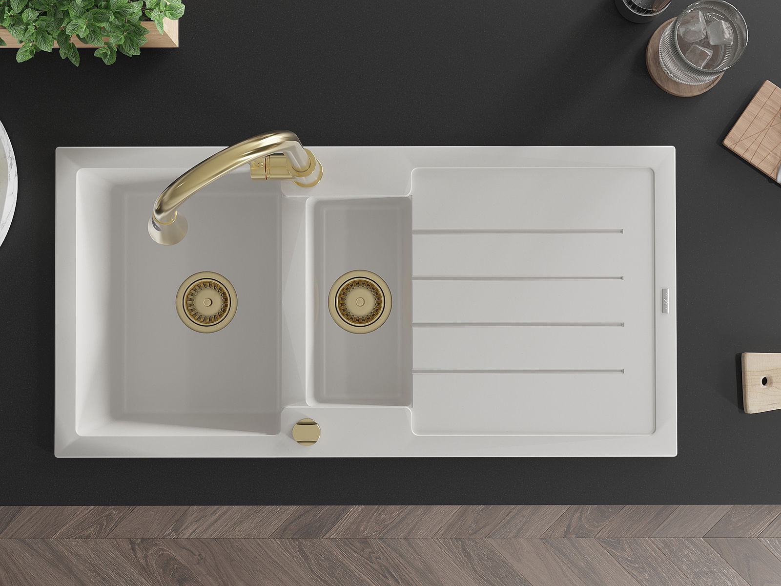 Mexen Andres chiuvetă de granit 1,5 compartimente cu scurgător și baterie de bucătărie Elia, alb - 6515-20-670101-50