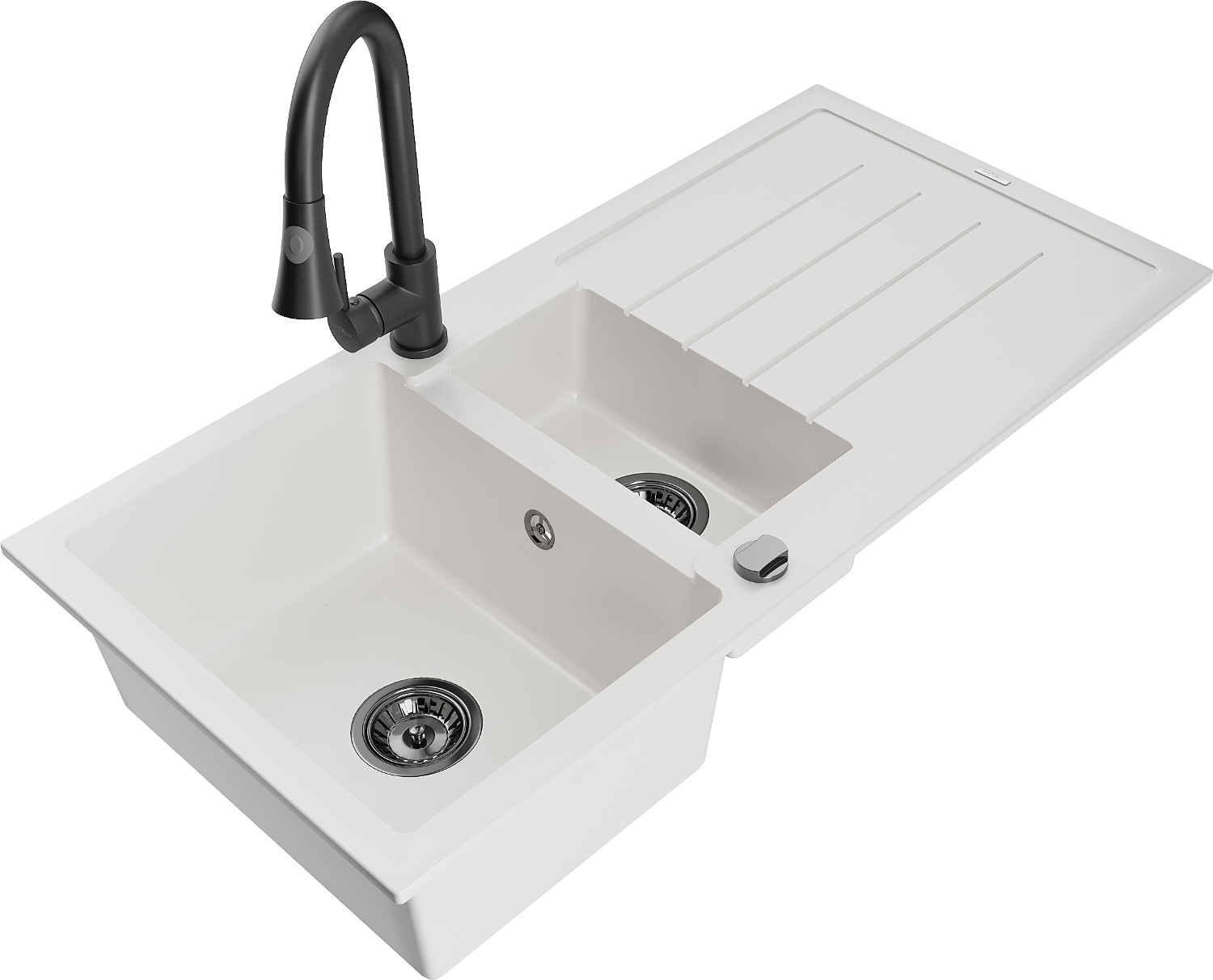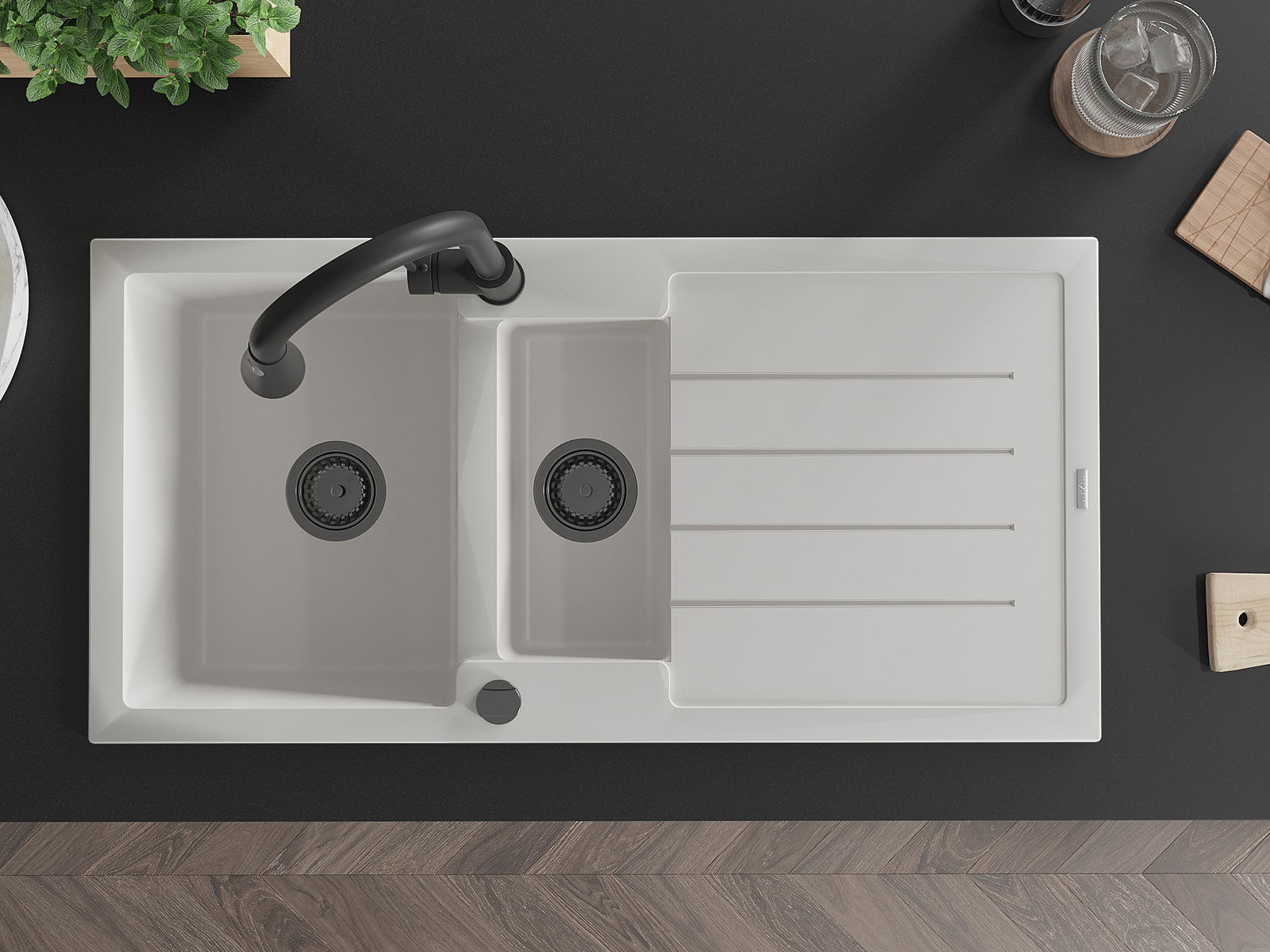 Mexen Andres chiuvetă de granit cu 1,5 cuve cu scurgător și baterie de bucătărie Elia, alb - 6515-20-670101-70