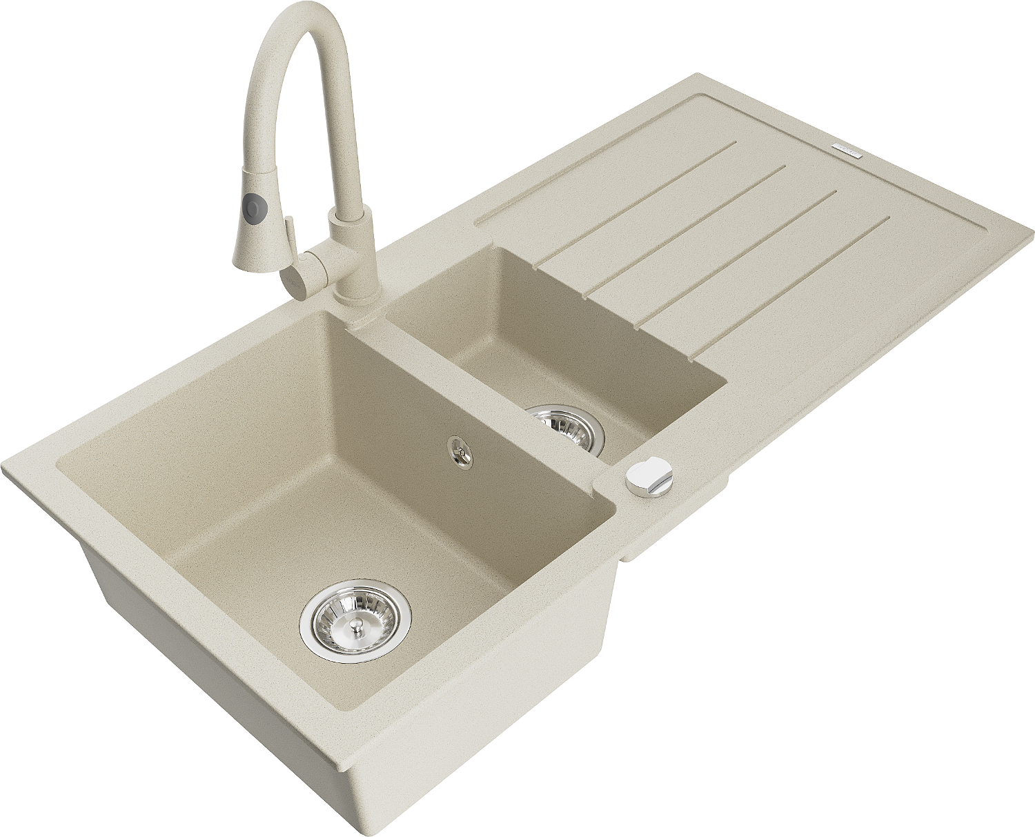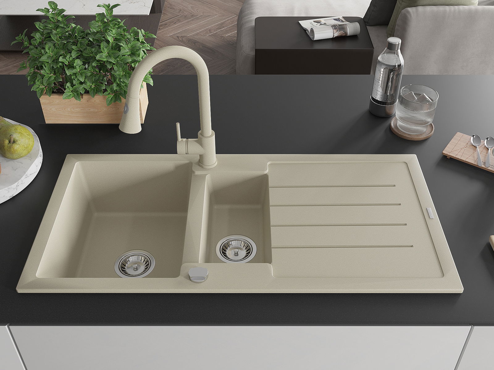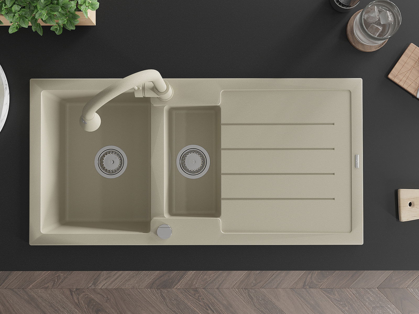 Mexen Andres chiuvetă de granit cu 1,5 compartimente cu scurgător și baterie de bucătărie Elia, bej - 6515-69-670101-69