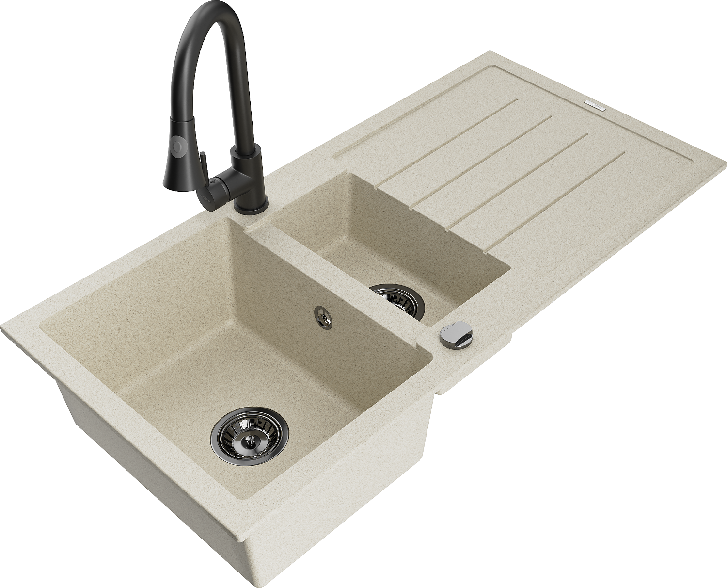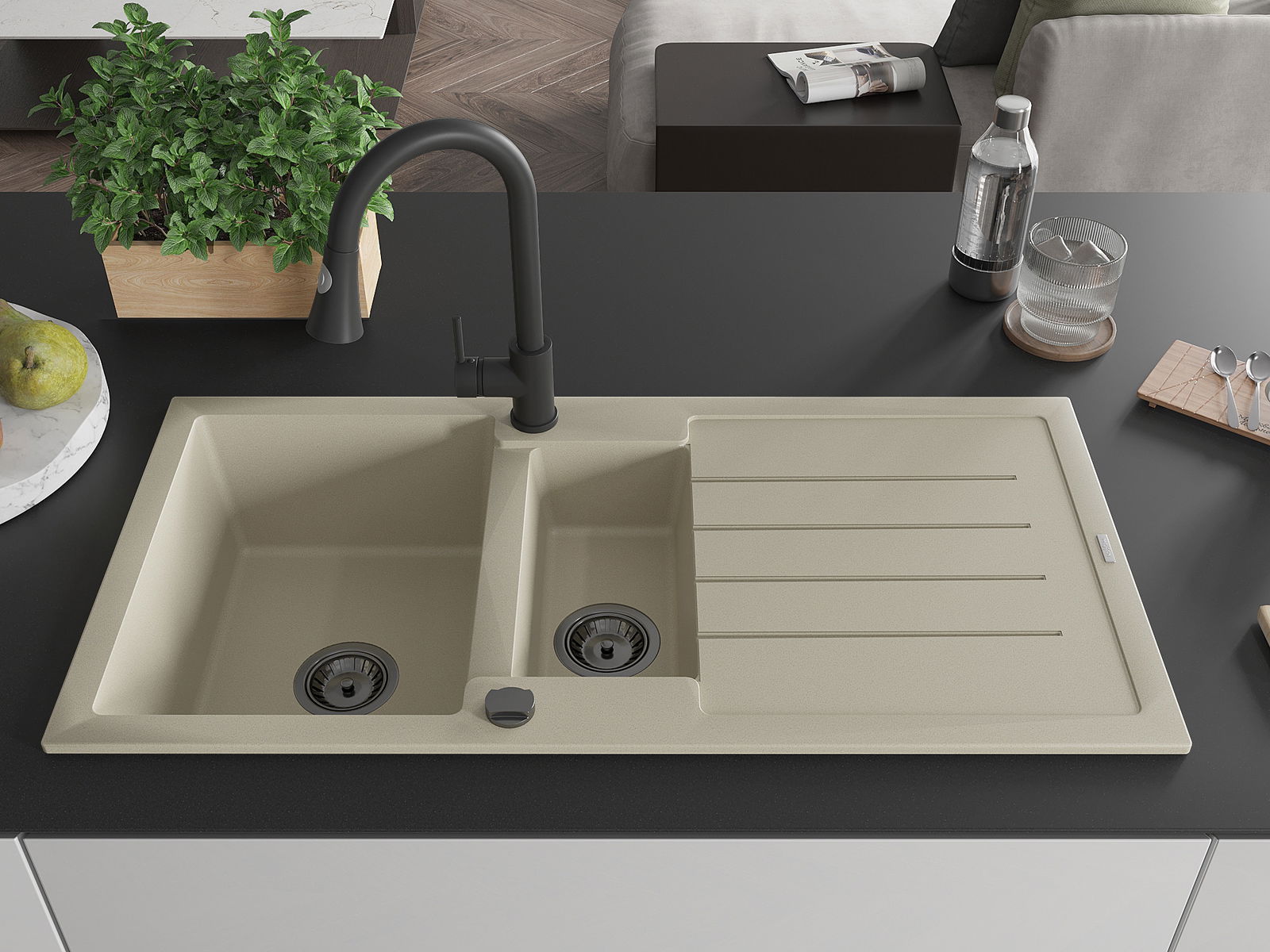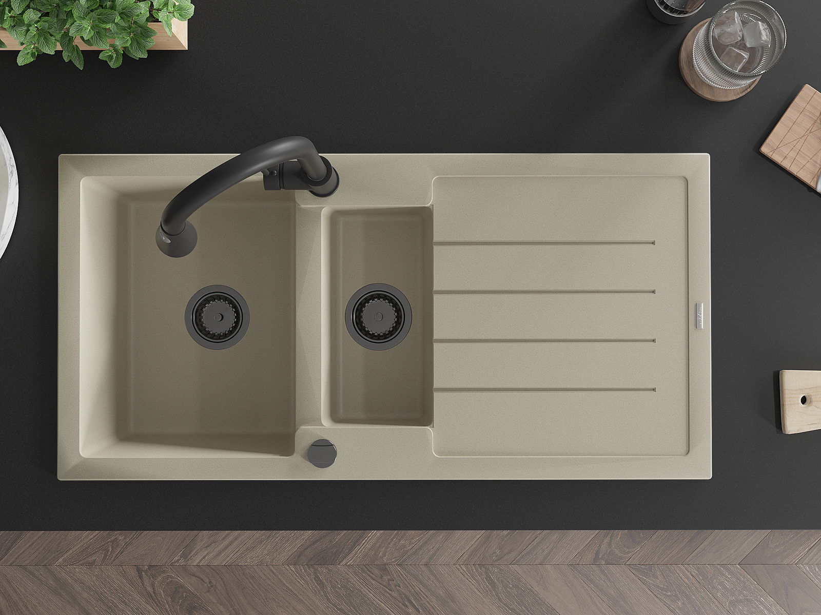 Mexen Andres chiuvetă din granit 1,5 cuve cu scurgător și baterie de bucătărie Elia, bej - 6515-69-670101-70