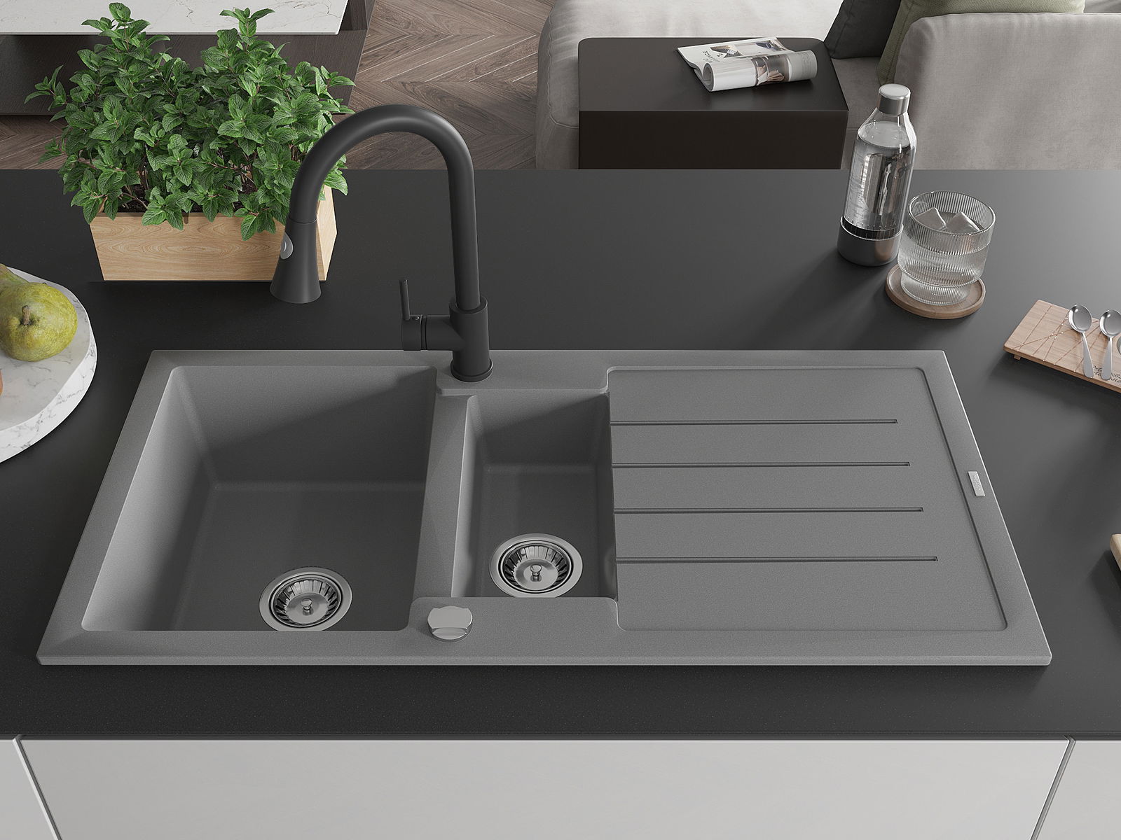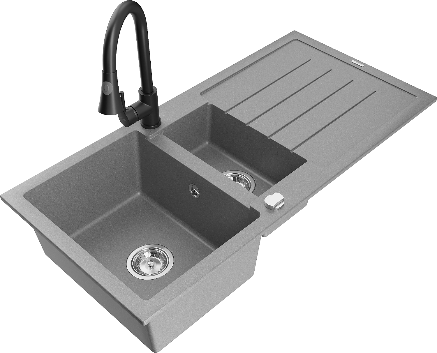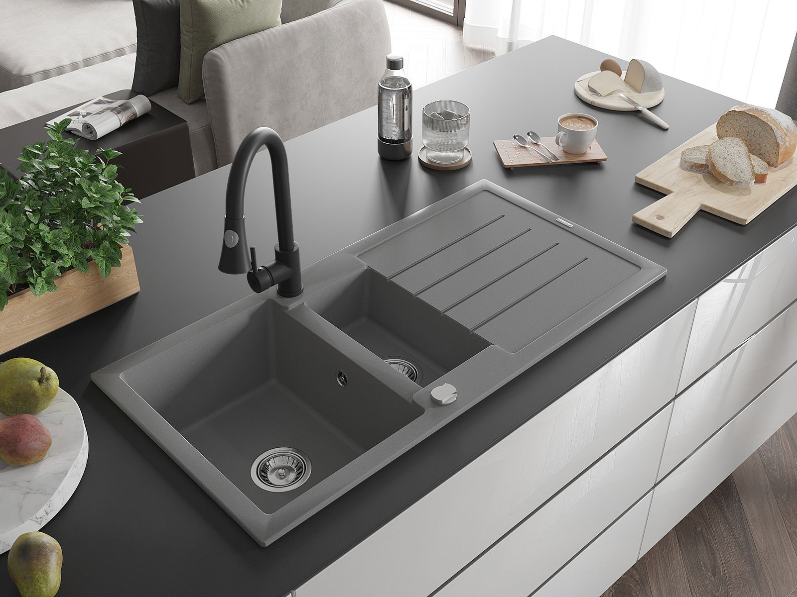 Mexen Andres chiuvetă din granit 1,5 compartimente cu scurgător și baterie de bucătărie Elia, gri - 6515-71-670101-70