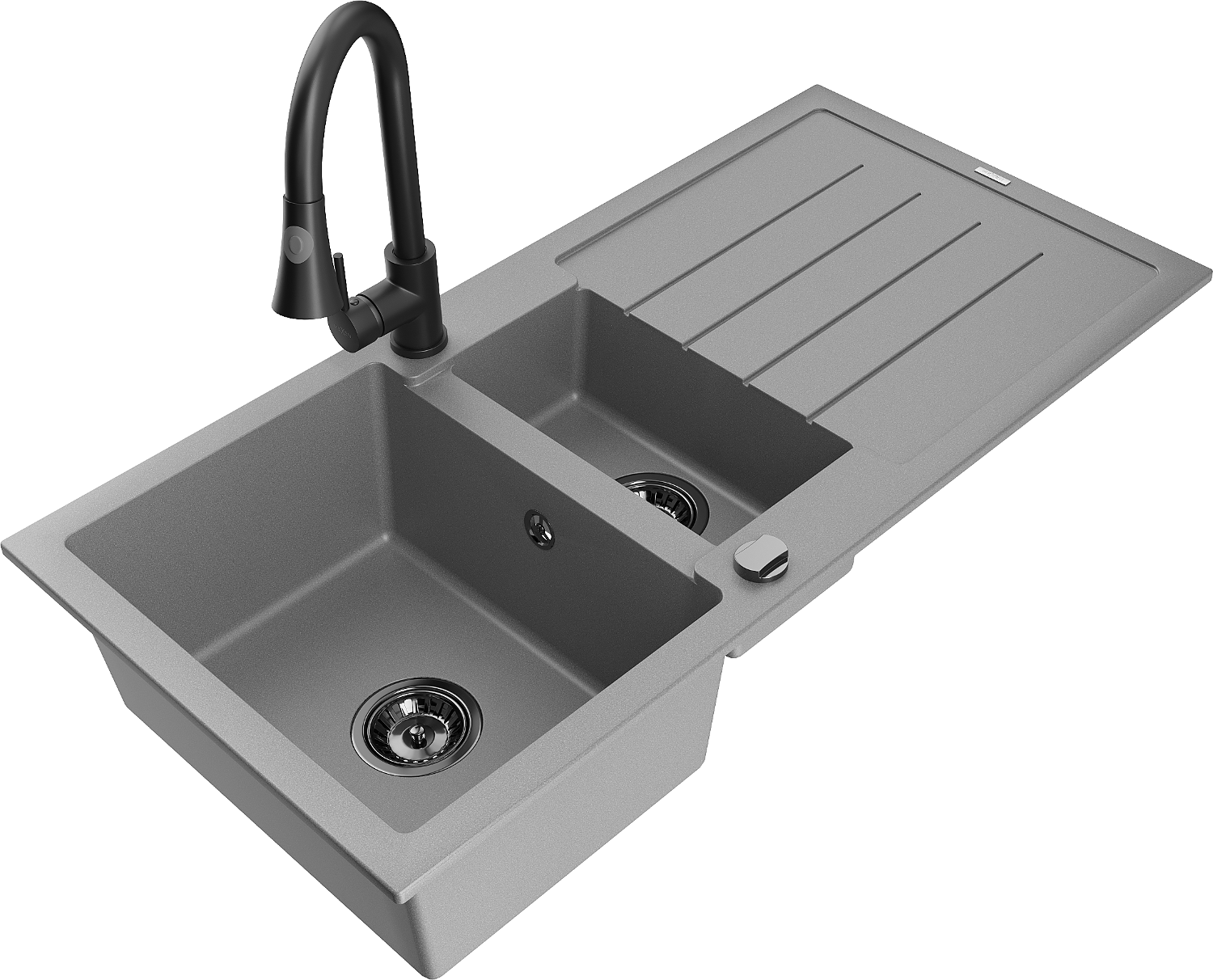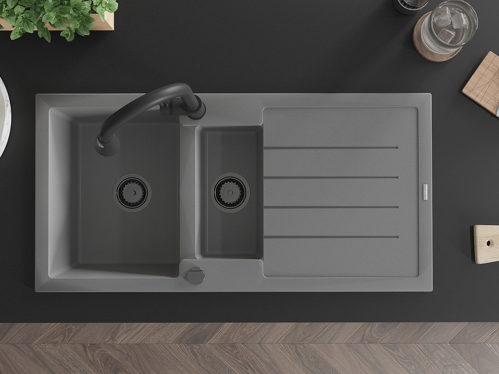Mexen Andres chiuvetă de granit 1,5 compartimente cu scurgător și baterie de bucătărie Elia, gri - 6515-71-670101-70-B