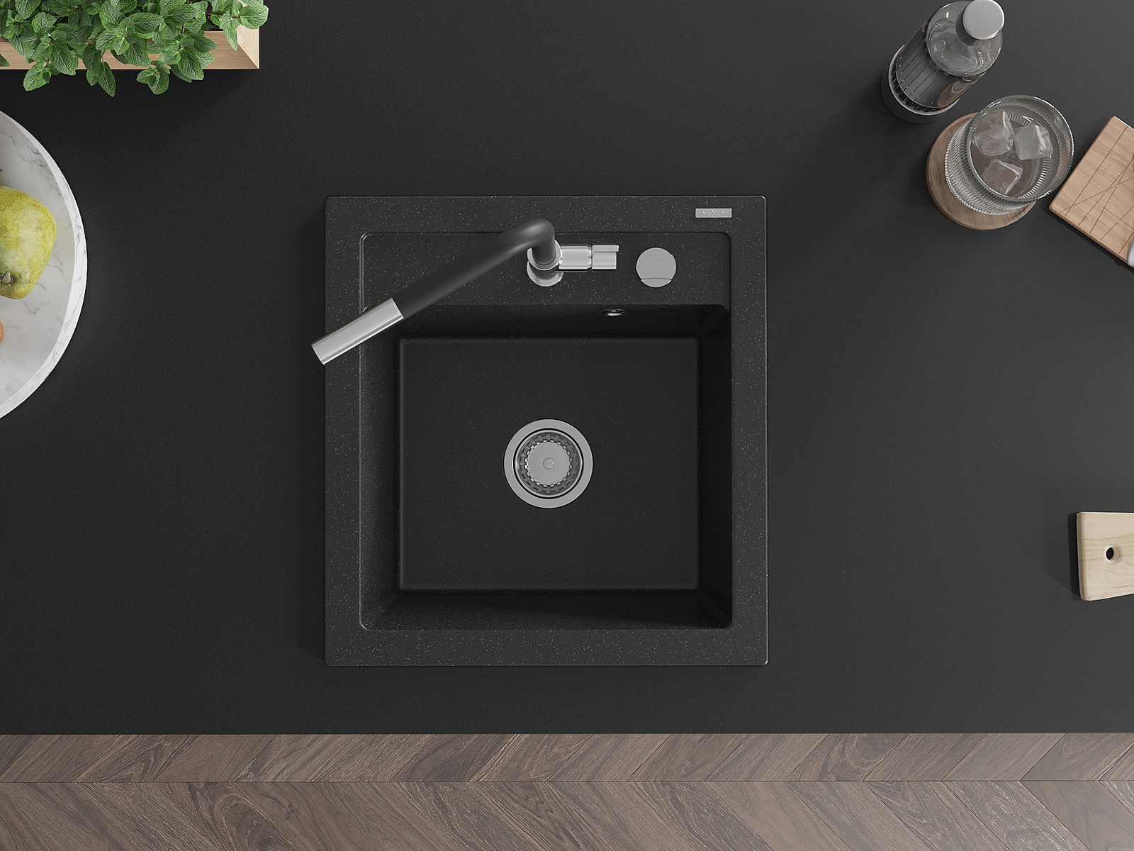 Mexen Vito chiuvetă de bucătărie din granit cu 1 compartiment și baterie Flora, negru/argintiu metalic - 6503-73-670401-07