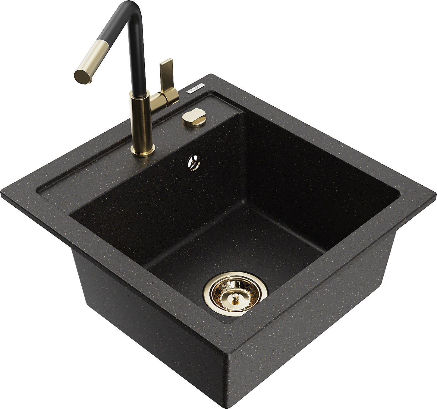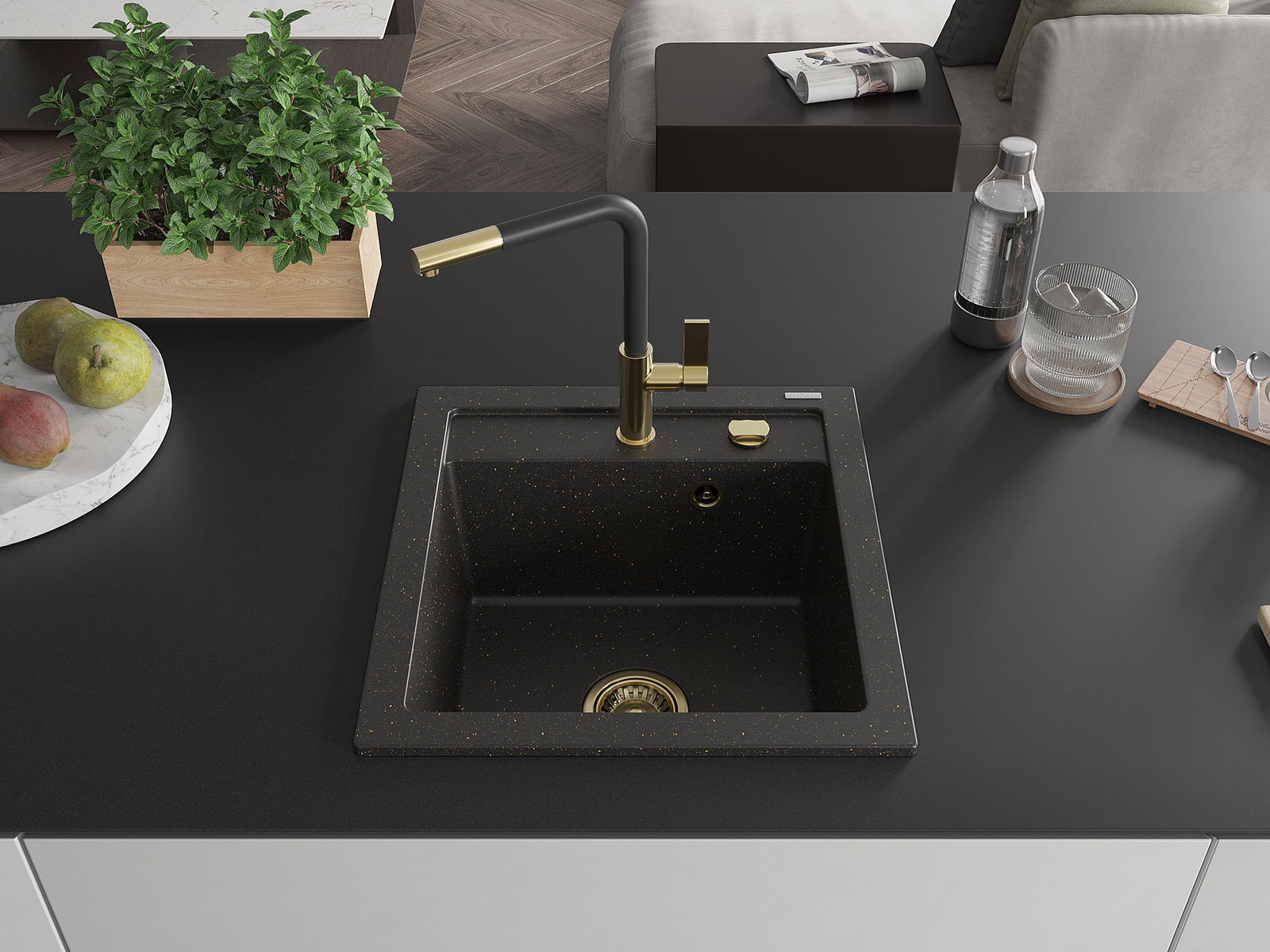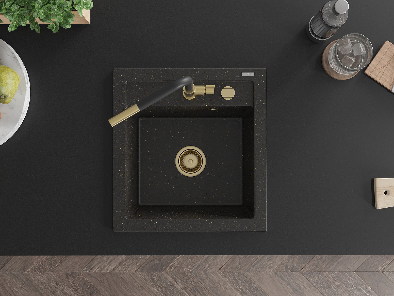 Mexen Vito chiuvetă de bucătărie din granit cu 1 compartiment și baterie Flora, negru/auriu metalizat - 6503-75-670401-57-G