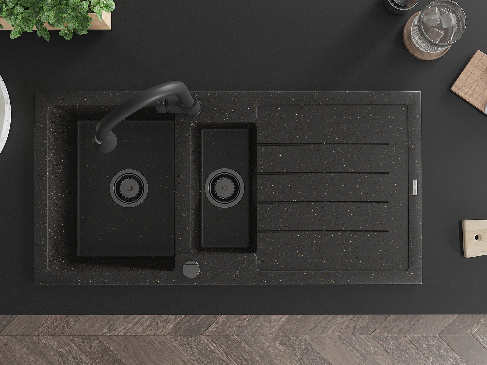 Mexen Andres chiuvetă de bucătărie din granit cu 1,5 cuve, cu scurgător și baterie de bucătărie Elia, negru/auriu metalic