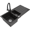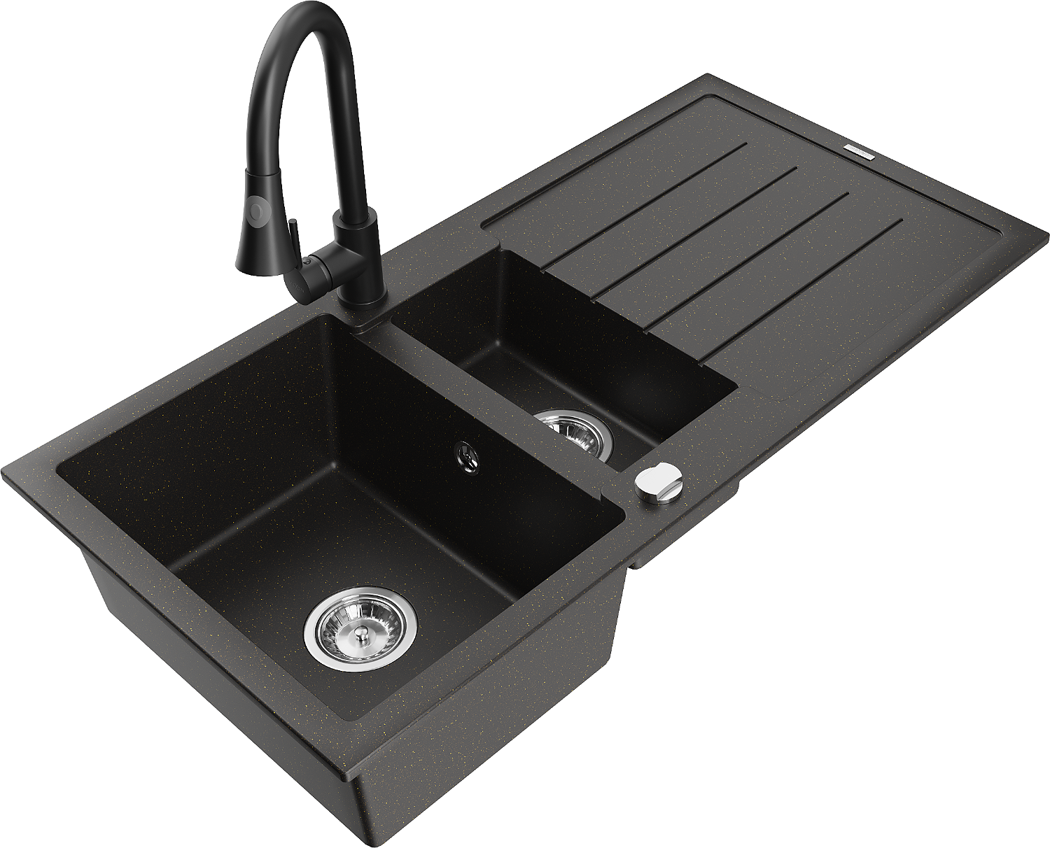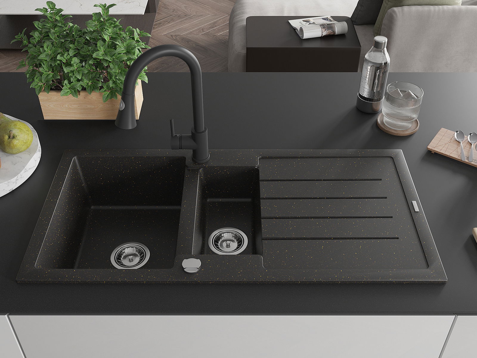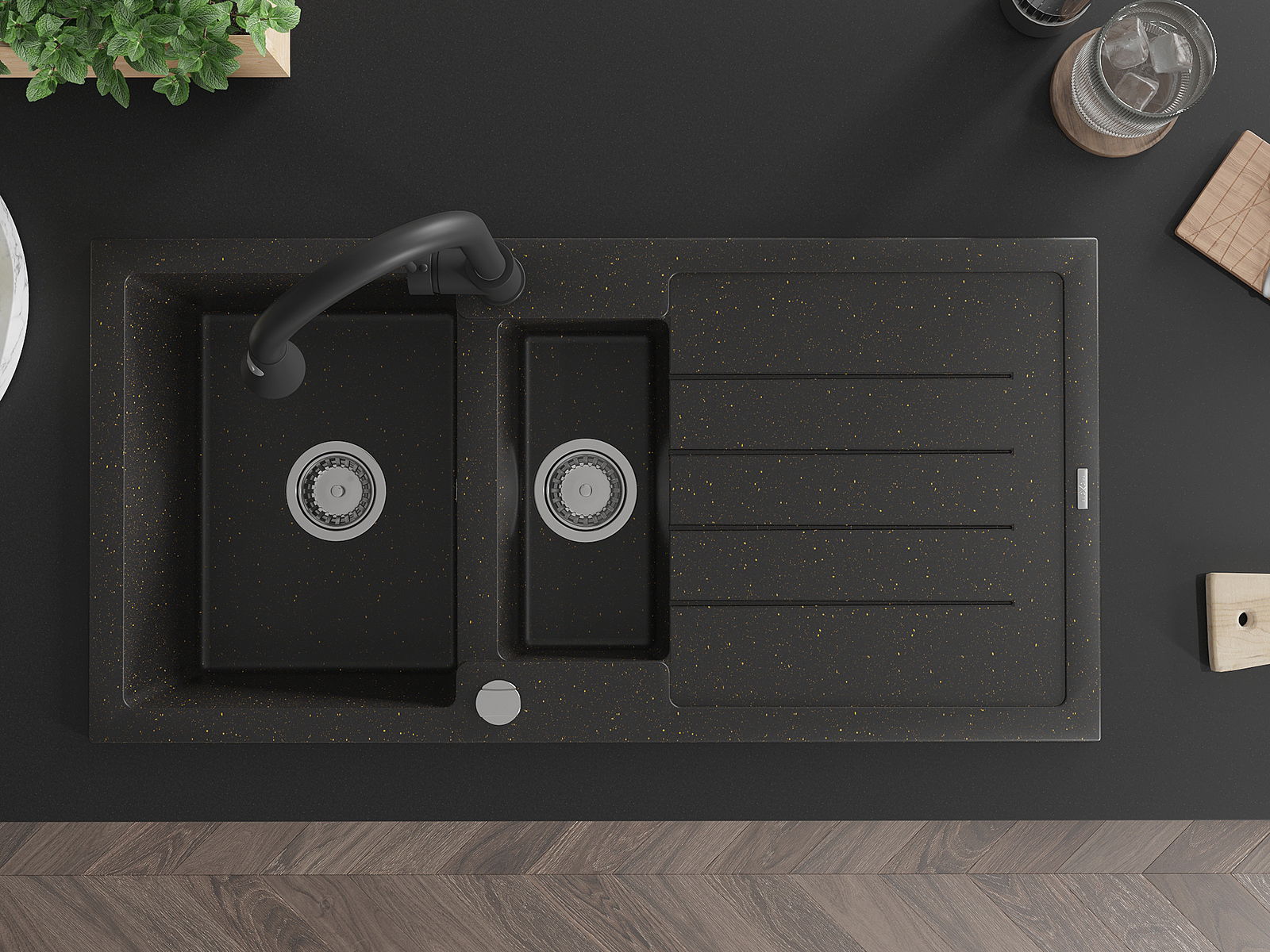 Mexen Andres chiuvetă de granit cu 1,5 compartimente cu scurgător și baterie de bucătărie Elia, negru/auriu metalic