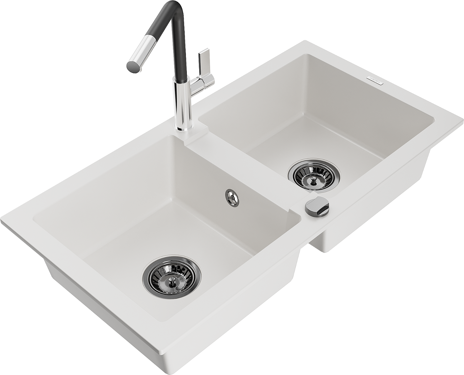 Mexen Mario chiuvetă din granit cu 2 compartimente și baterie de bucătărie Flora, alb - 6504-20-670401-07-B