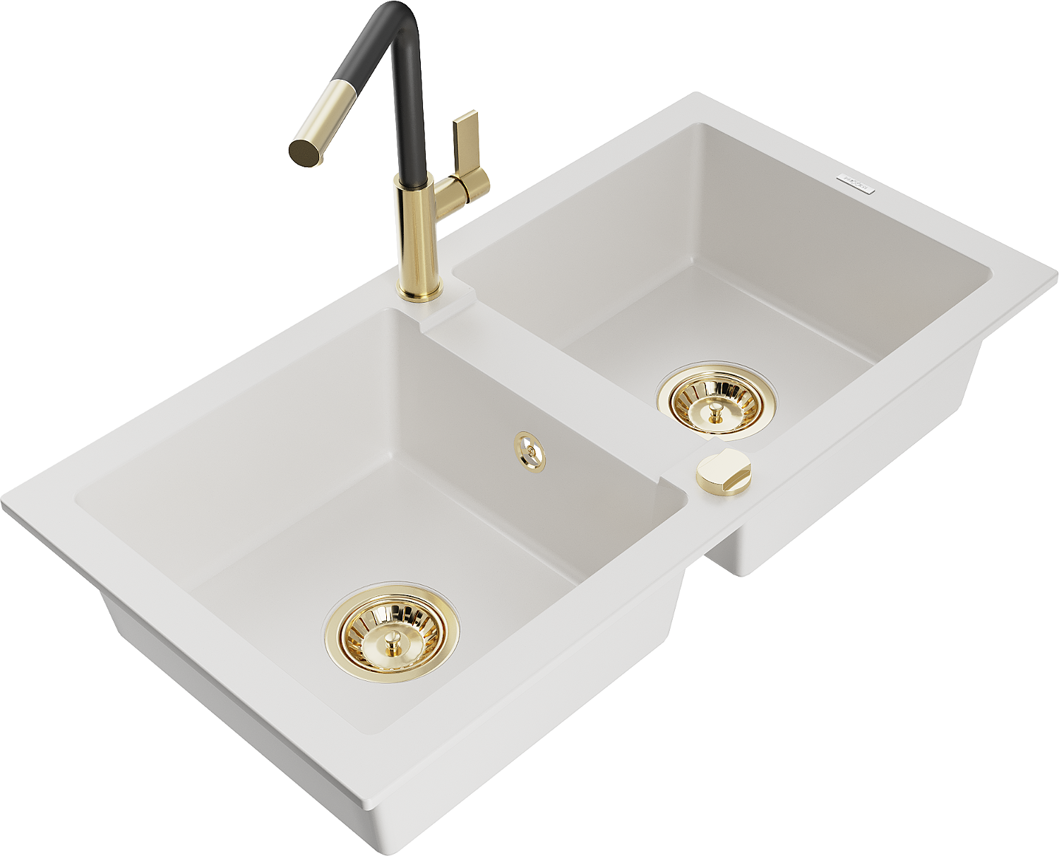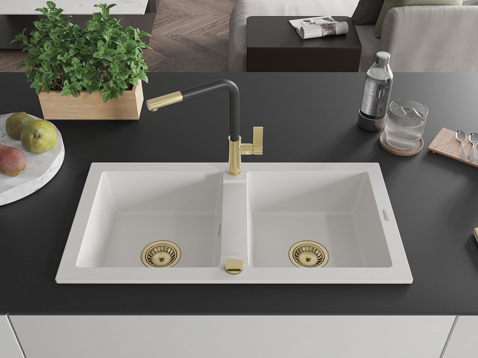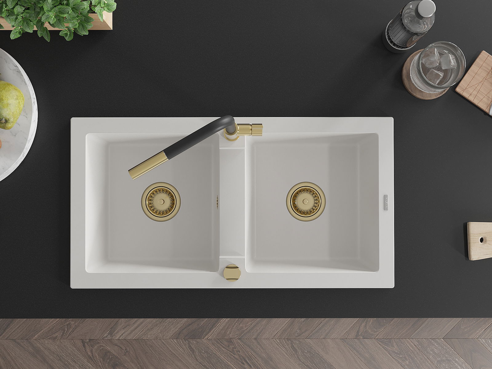 Mexen Mario chiuvetă de granit cu 2 compartimente cu baterie de bucătărie Flora, alb - 6504-20-670401-57-G