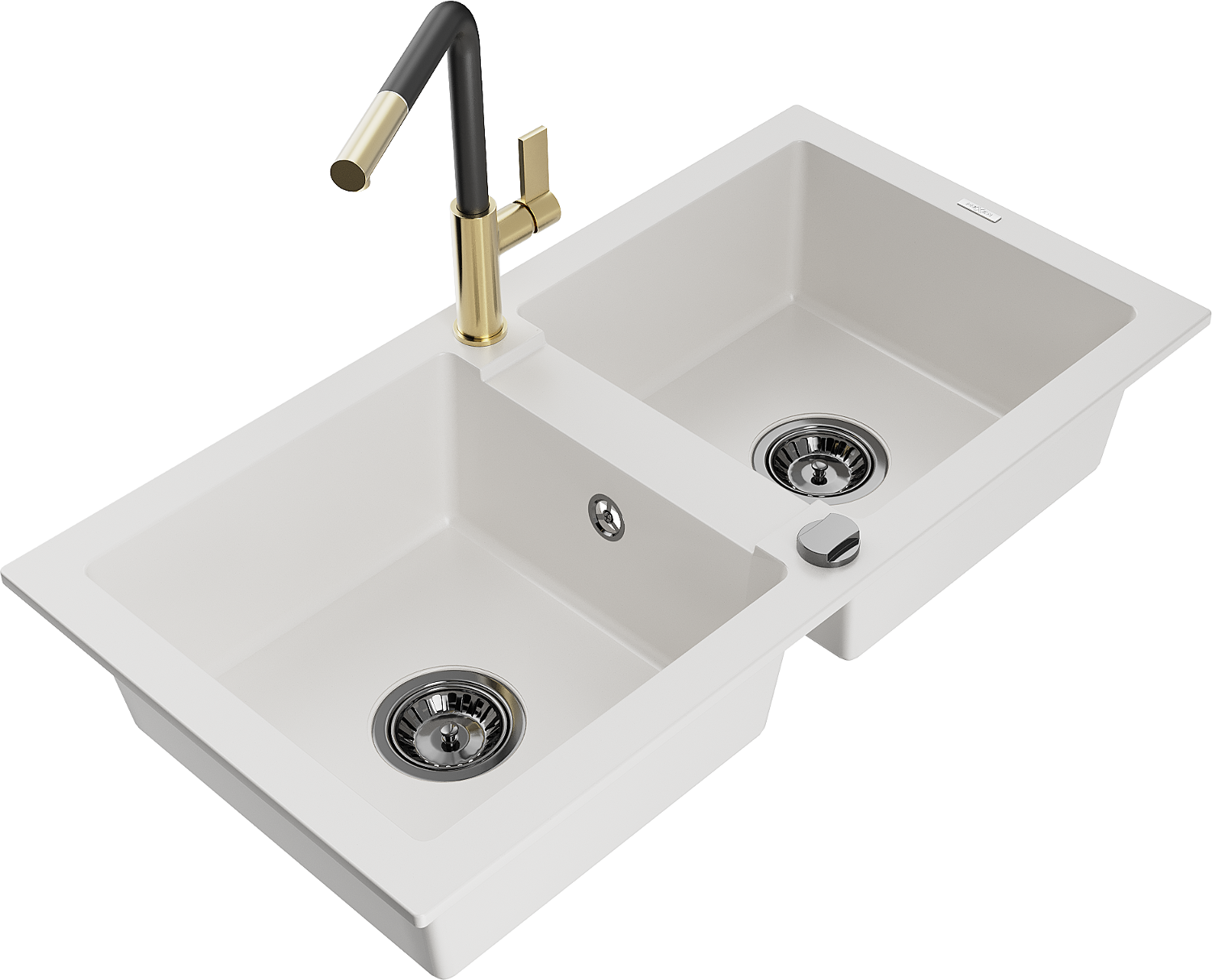 Mexen Mario chiuvetă de granit cu 2 compartimente și baterie de bucătărie Flora, alb - 6504-20-670401-57-B