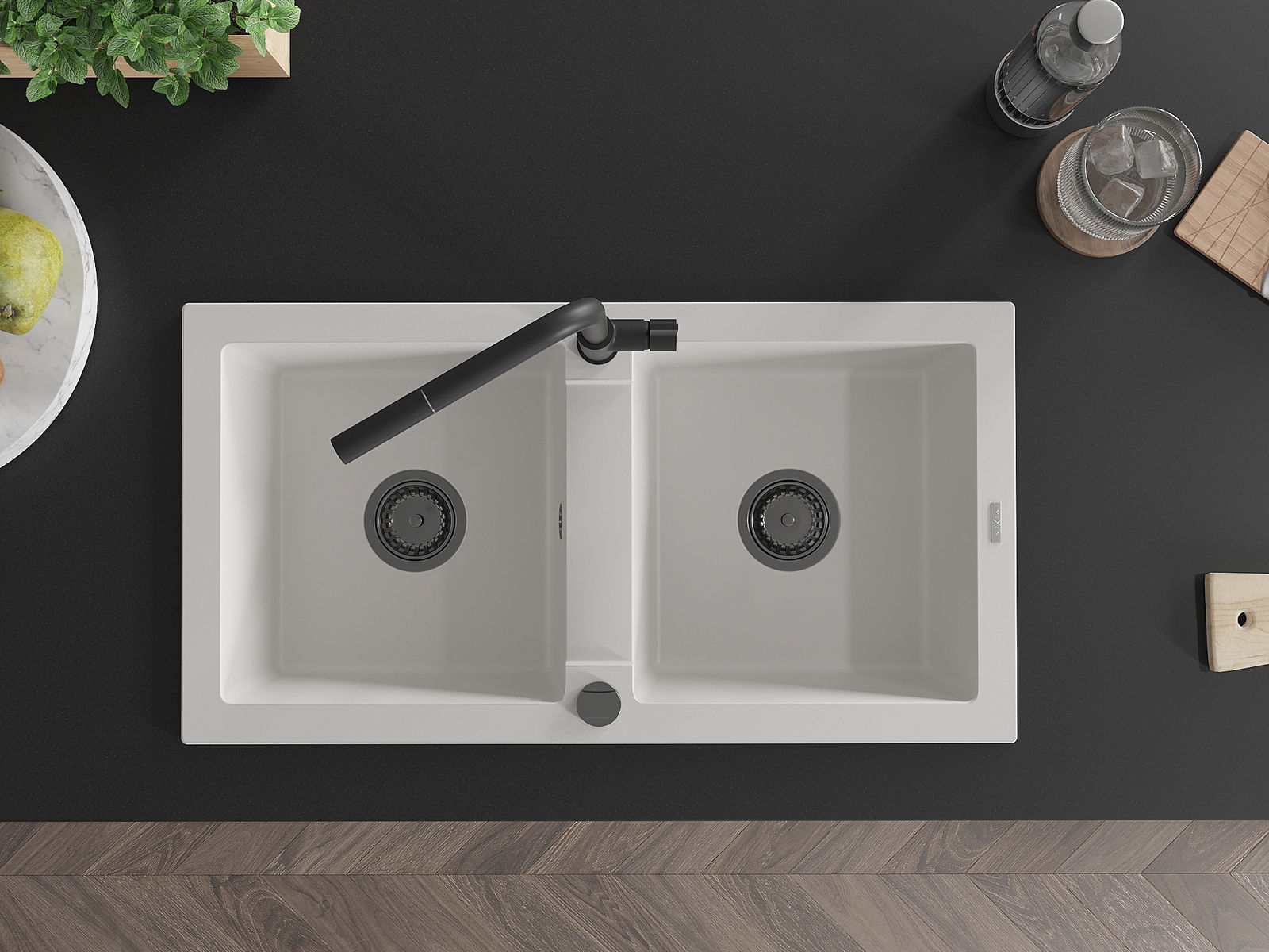 Mexen Mario chiuvetă de bucătărie din granit cu 2 compartimente și baterie Flora, alb - 6504-20-670401-70-B