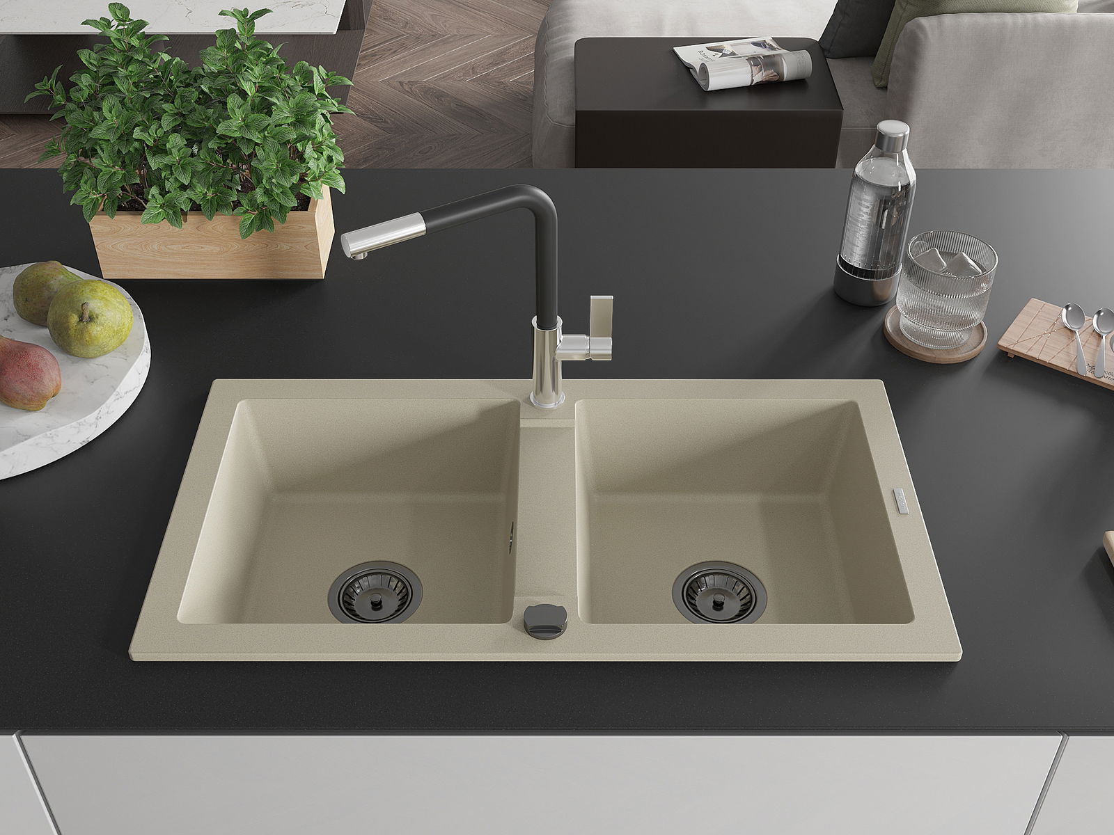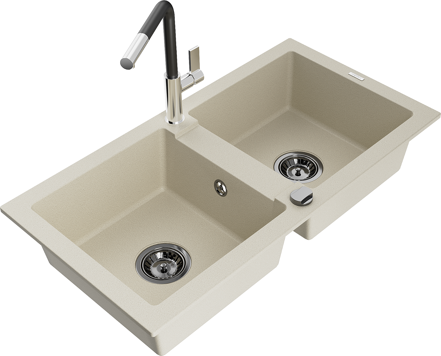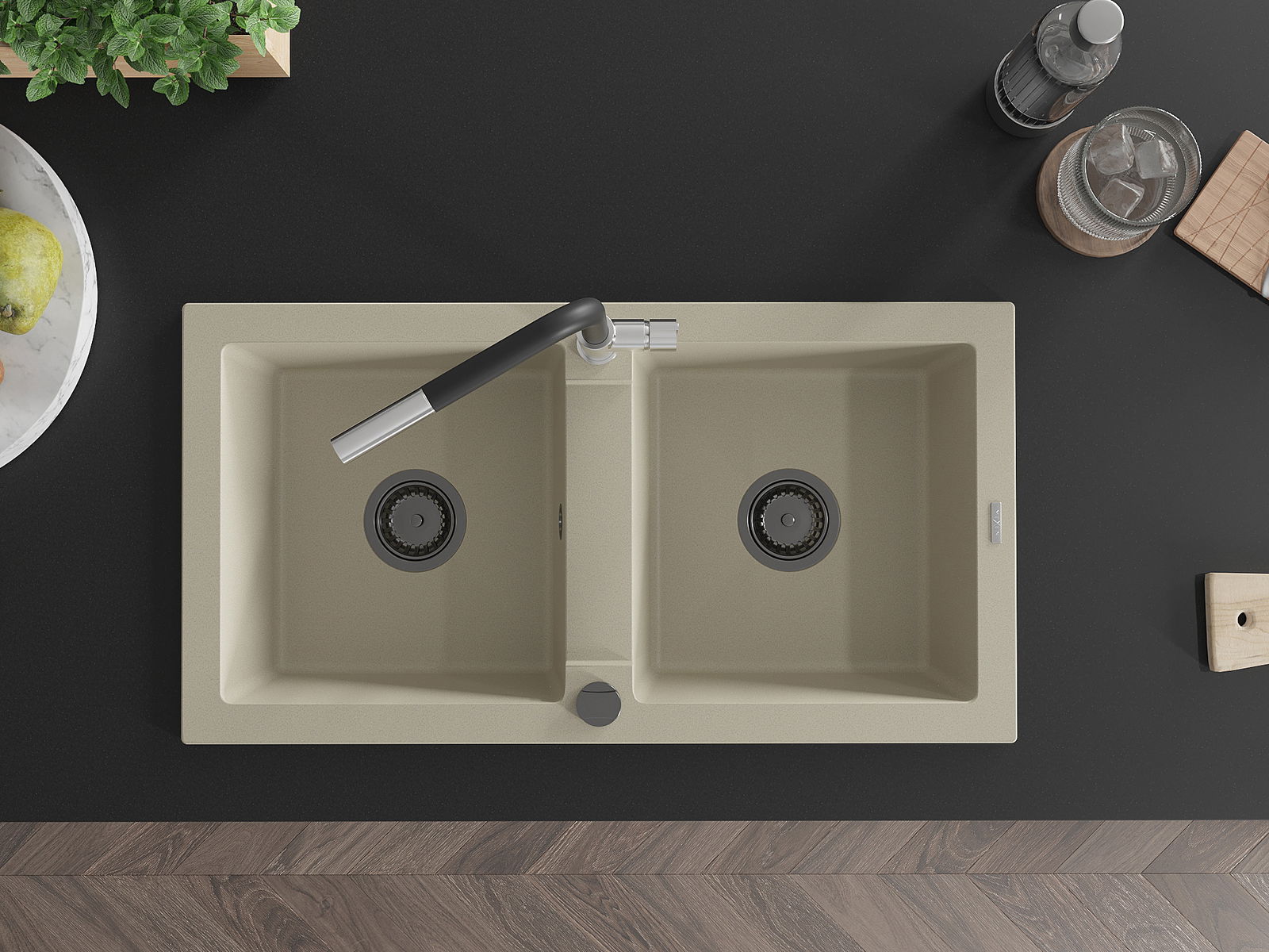 Mexen Mario chiuvetă de granit cu 2 compartimente cu baterie de bucătărie Flora, bej - 6504-69-670401-07-B