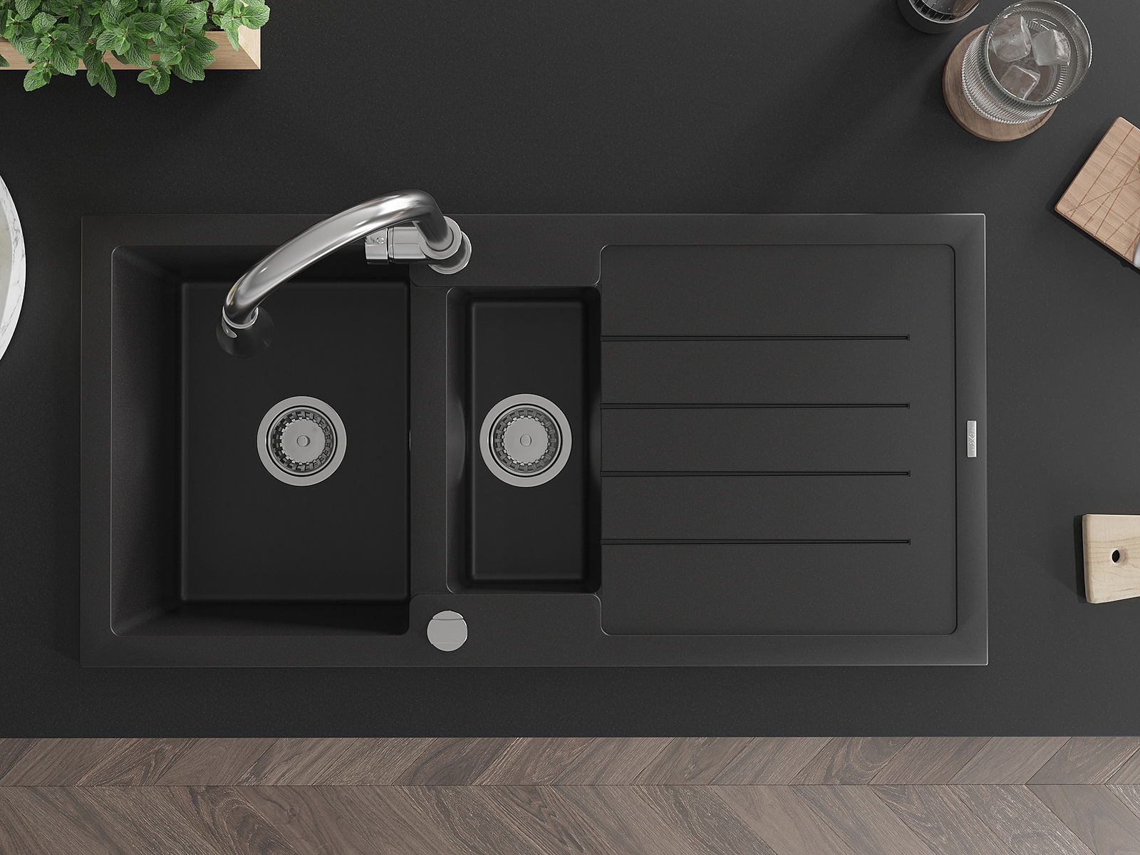 Mexen Andres chiuvetă de granit cu 1,5 compartimente cu scurgător și baterie de bucătărie Elia, negru - 6515-77-670101-00