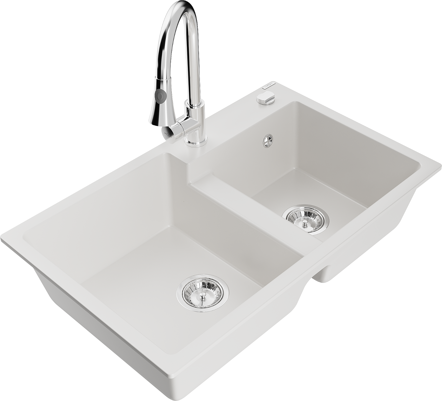 Mexen Tomas chiuvetă de bucătărie din granit cu 2 cuve și baterie de bucătărie Elia, alb - 6516-20-670101-00