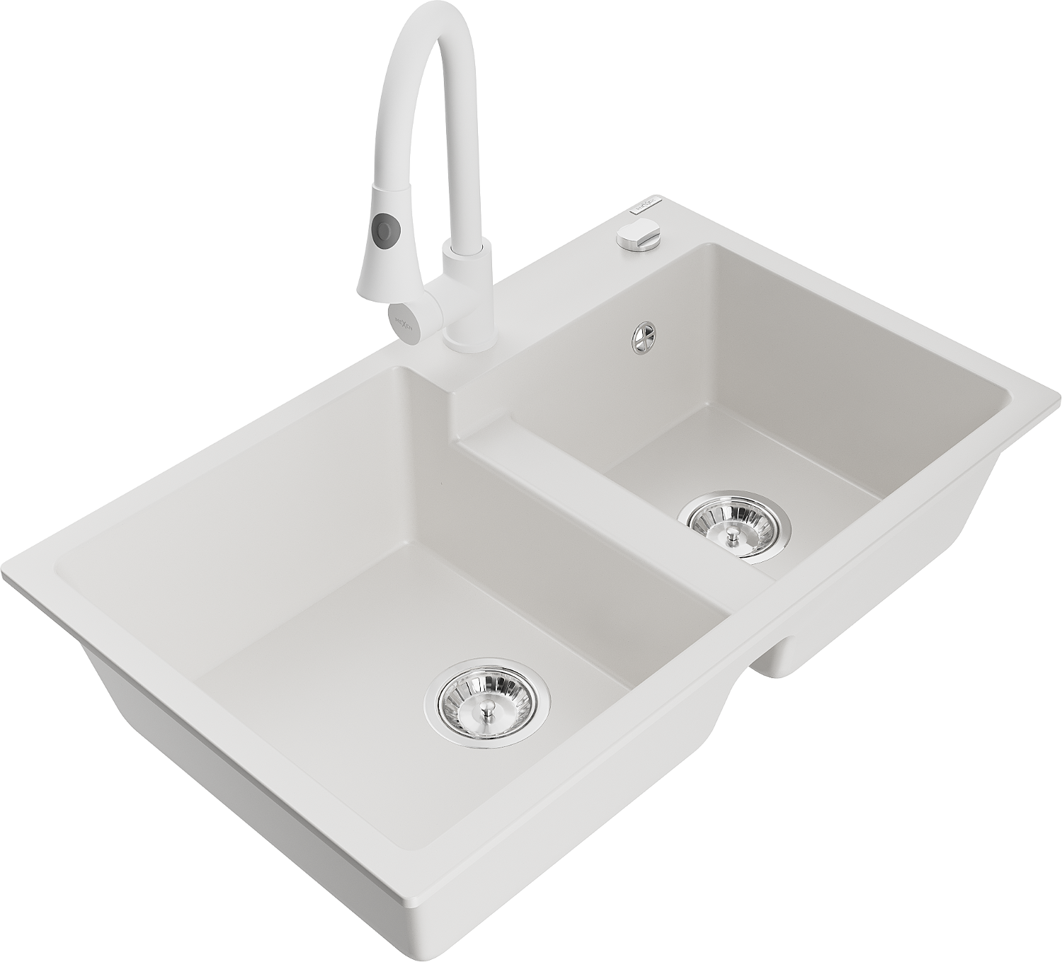 Mexen Tomas chiuvetă granit 2-camere cu baterie de bucătărie Elia, alb - 6516-20-670101-20