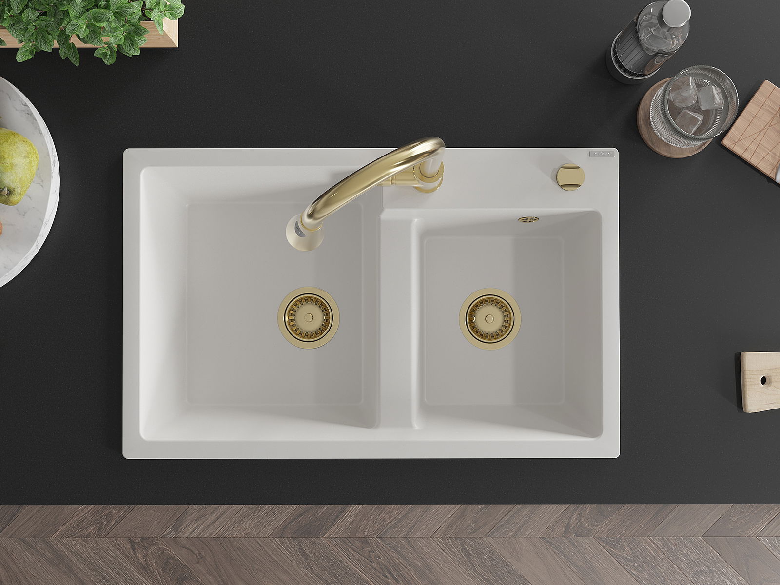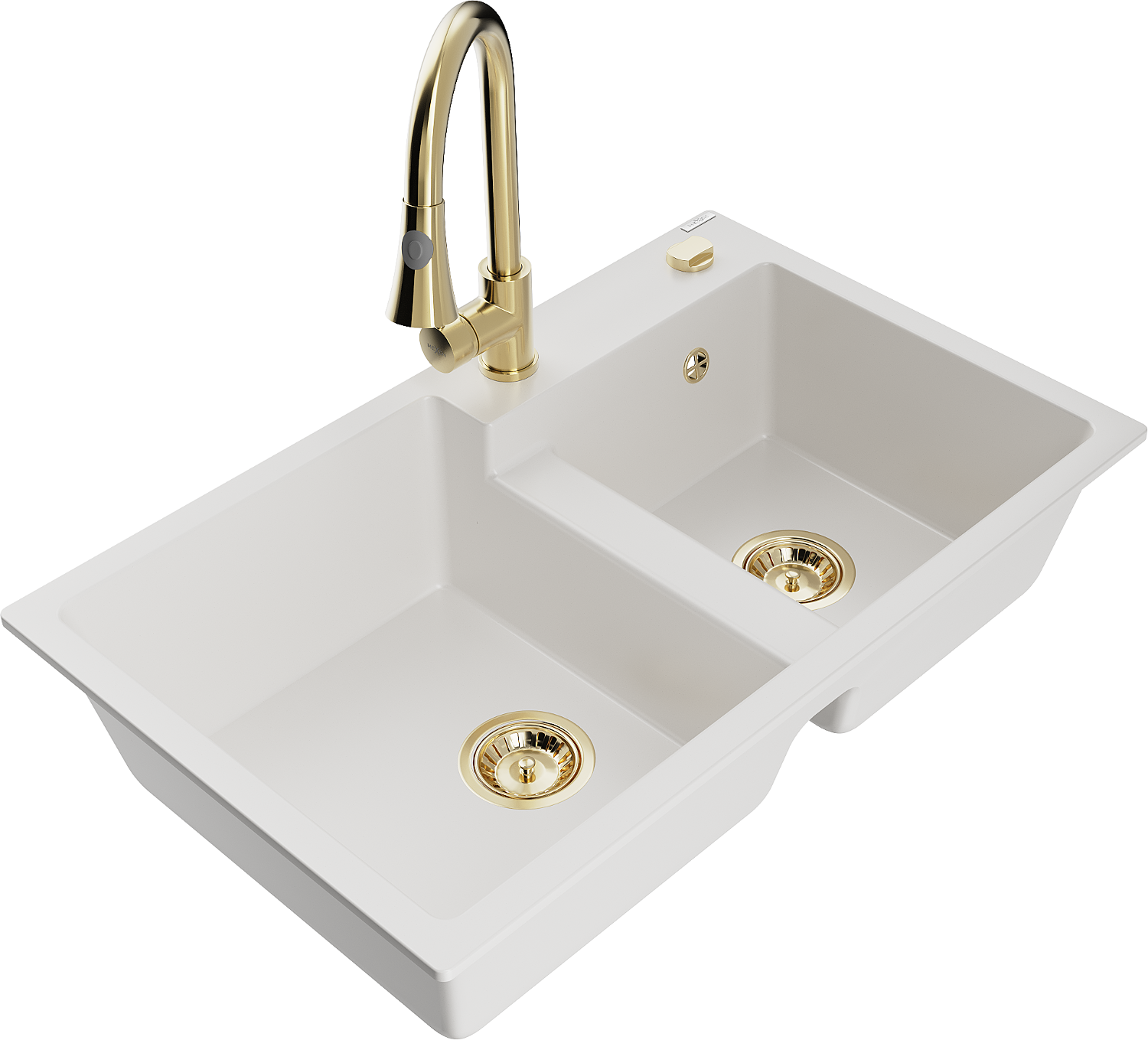 Mexen Tomas chiuvetă de granit cu 2 compartimente și baterie de bucătărie Elia, alb - 6516-20-670101-50