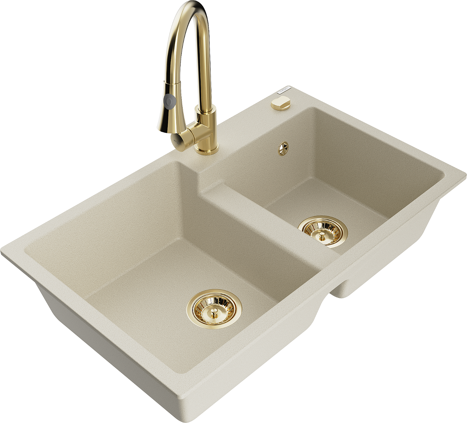 Chiuvetă din granit Mexen Tomas cu 2 compartimente și baterie de bucătărie Elia, bej - 6516-69-670101-50