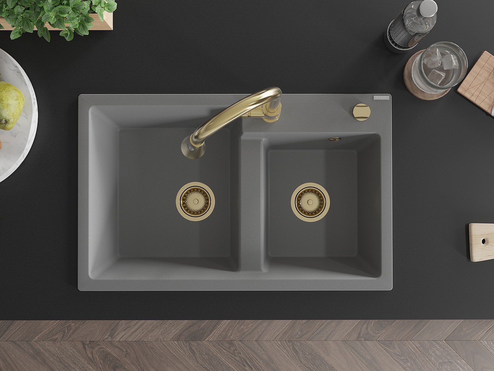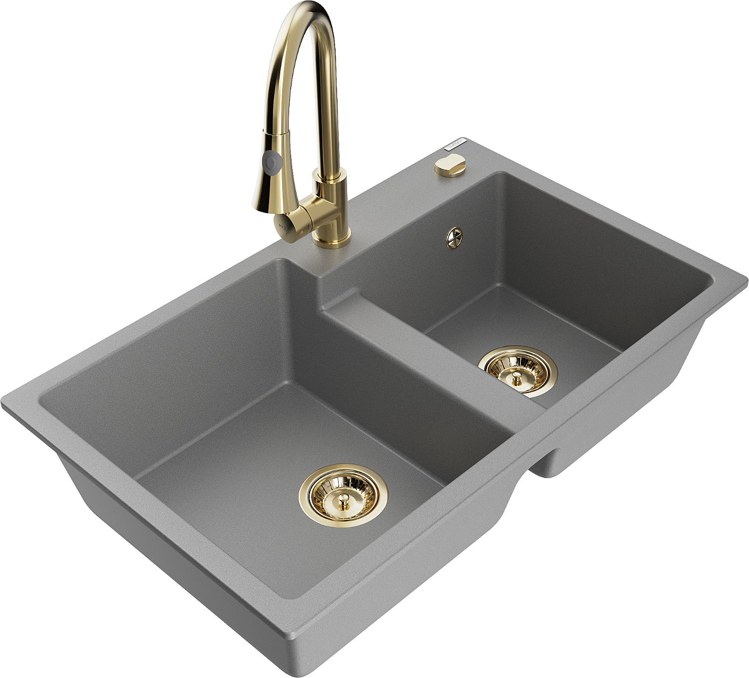 Mexen Tomas chiuvetă de bucătărie din granit cu 2 compartimente și baterie de bucătărie Elia, gri - 6516-71-670101-50
