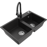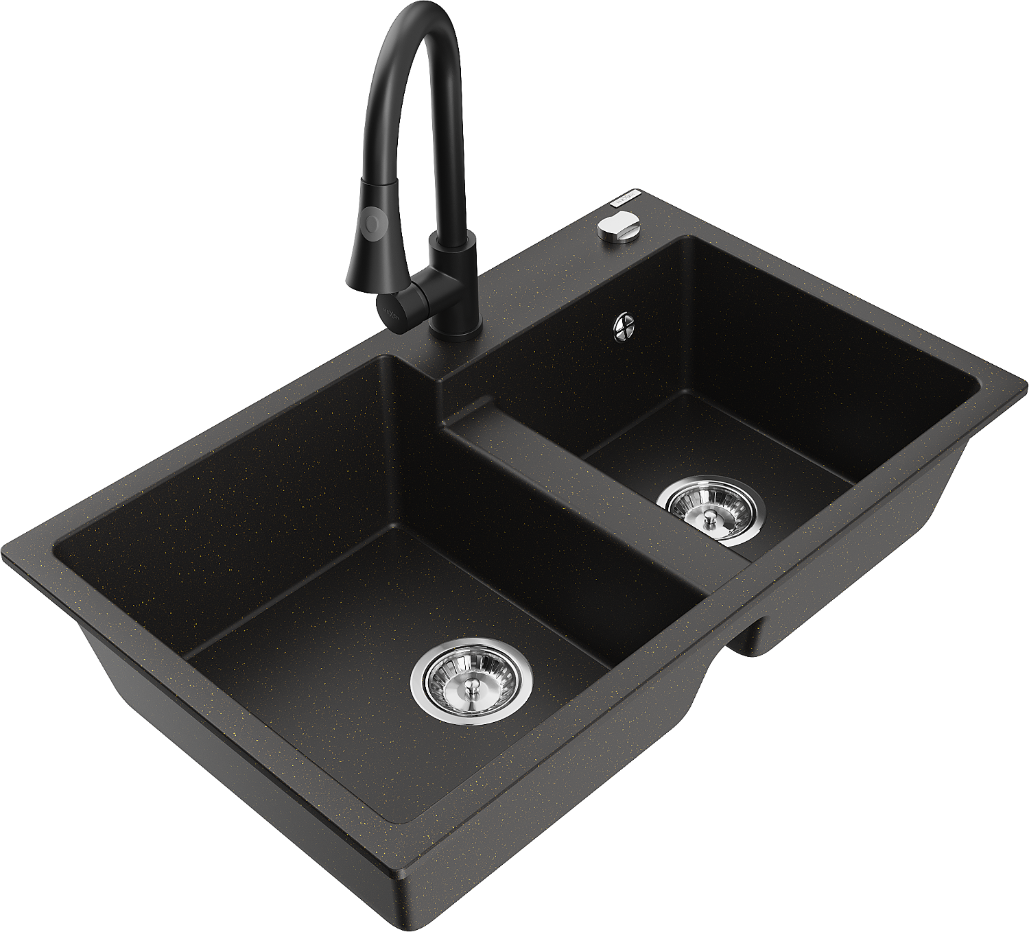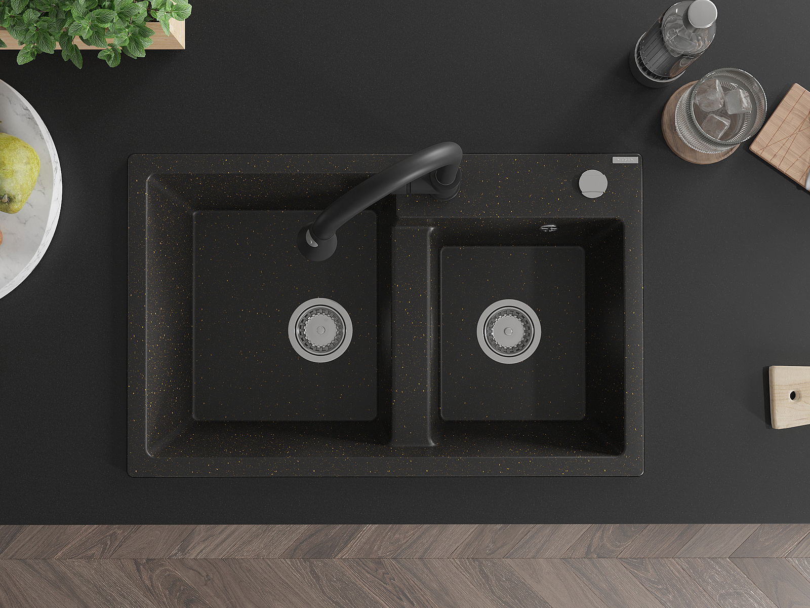 Mexen Tomas chiuvetă de bucătărie din granit cu 2 compartimente și baterie Elia, negru/auriu metalic - 6516-75-670101-70