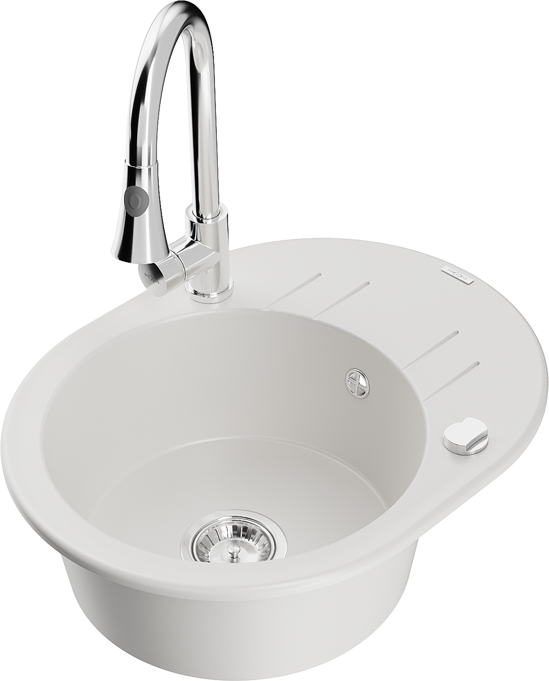 Mexen Kevin chiuvetă de granit cu 1 compartiment cu scurgător și baterie de bucătărie Elia, alb - 6517-20-670101-00