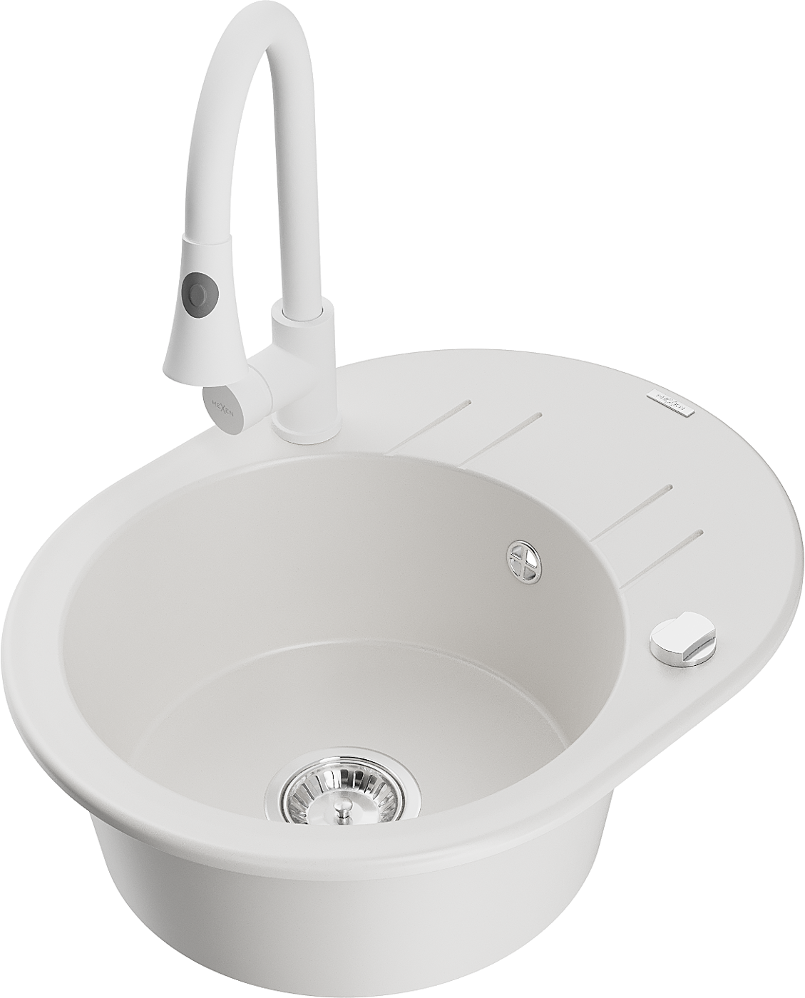 Mexen Kevin chiuvetă de granit cu 1 compartiment, cu scurgător și baterie de bucătărie Elia, alb - 6517-20-670101-20