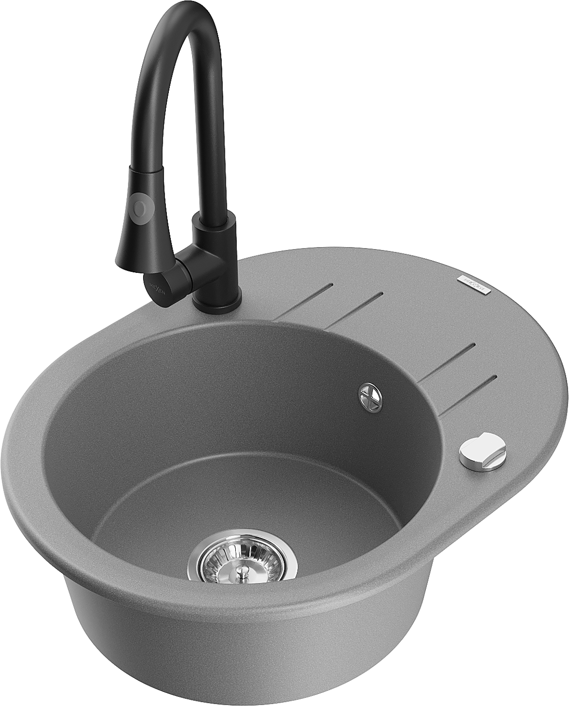 Mexen Kevin chiuvetă de bucătărie din granit cu 1 cuvă, cu uscător și baterie de bucătărie Elia, gri - 6517-71-670101-70